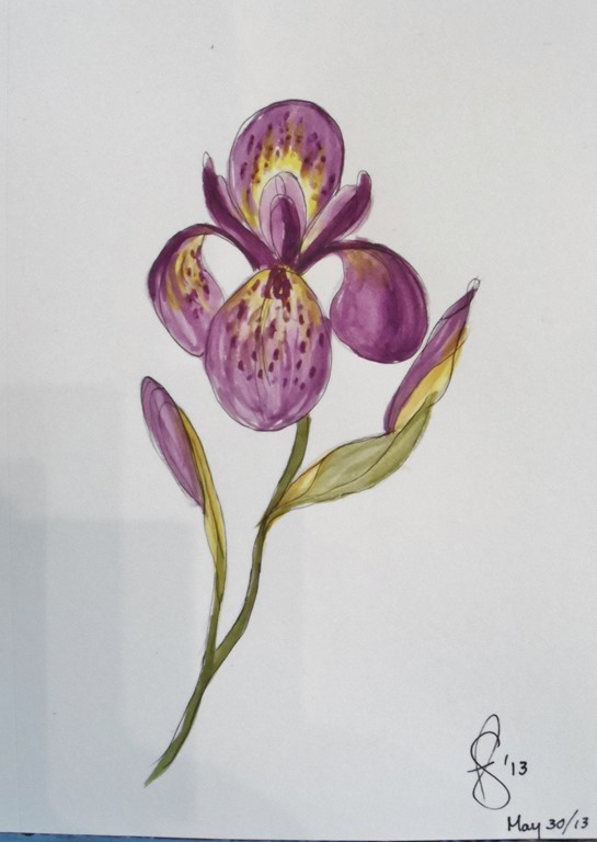 Posted: May 30, 2013 Filed under: Gardening/Flowers, Watercolors | Tags: Flowers, Local artist, original art, Paintings from the garden, Paintings of Flowers, Shuswap Art, water colors 9 CommentsA quick sketch today. I haven’t dabbled in water colors for awhile. The pond iris is in full bloom right now. For a change it wasn’t raining this afternoon. So outdoors I went. Parked myself on the deck with water colors and sketch pad and this was the result. It felt good just to be outside after a week long marathon of bookkeeping chores. Too bad a girl has to work between stints at the easel!!