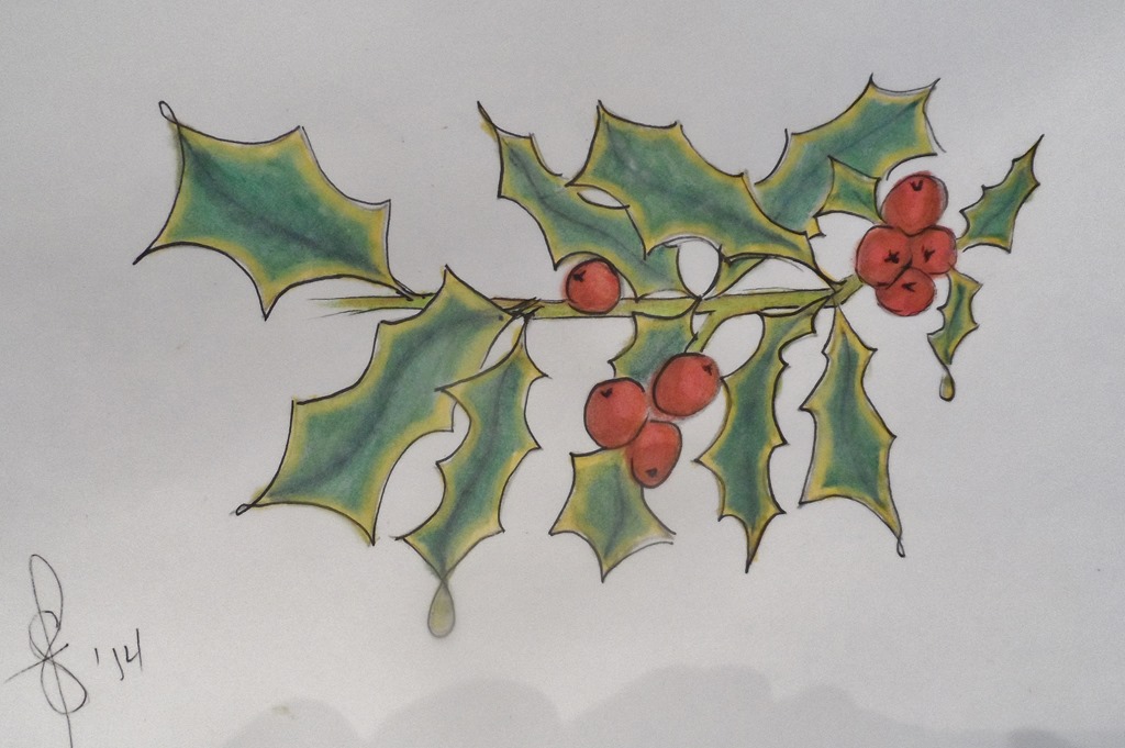 A quick sketch by Susan Feniak.  Derwent water color pencils and Pigma ink on Opus Essential Sketch Book  A favourite time of year is on the way so my thoughts are starting to turn to all things Christmas.  To me Christmas time is the one high point of winter.  Crisp, cool, sun filled days are few and far between so they are very much enjoyed as well.  Today is such a day.  I will be sure to go for a walk and point my sun starved face toward the orb in the sky!