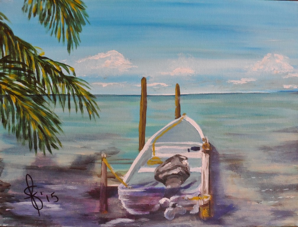 It is finished.  I am very happy with how the Caribbean colors came to life in this painting. To get depth into the shallow water surrounding the boat and to make it even look like water I tried my hand at scumbling.  I used the same technique for the shadows and the shade from the palm trees too.  I am sure I have tackled that before now but I didn’t have a name for it.  Patience and a light touch required!  I hope this painting leaves you feeling warm and sunny!  Cheers, Susan