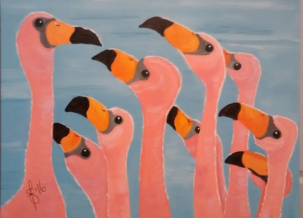 • “There Is One In Every Crowd ” original art by Susan Feniak.  Acrylic on canvas board 18″ x 24″. It would seem that lately I have a thing for Flamingos!  They are beautiful and an awful lot of fun to create.  This gang are stylized to suit my mood and where I plan to hang them.  Unless of course I am lucky enough to have someone snap the painting up.  In that case I will happily paint another version!! Cheers PEACE