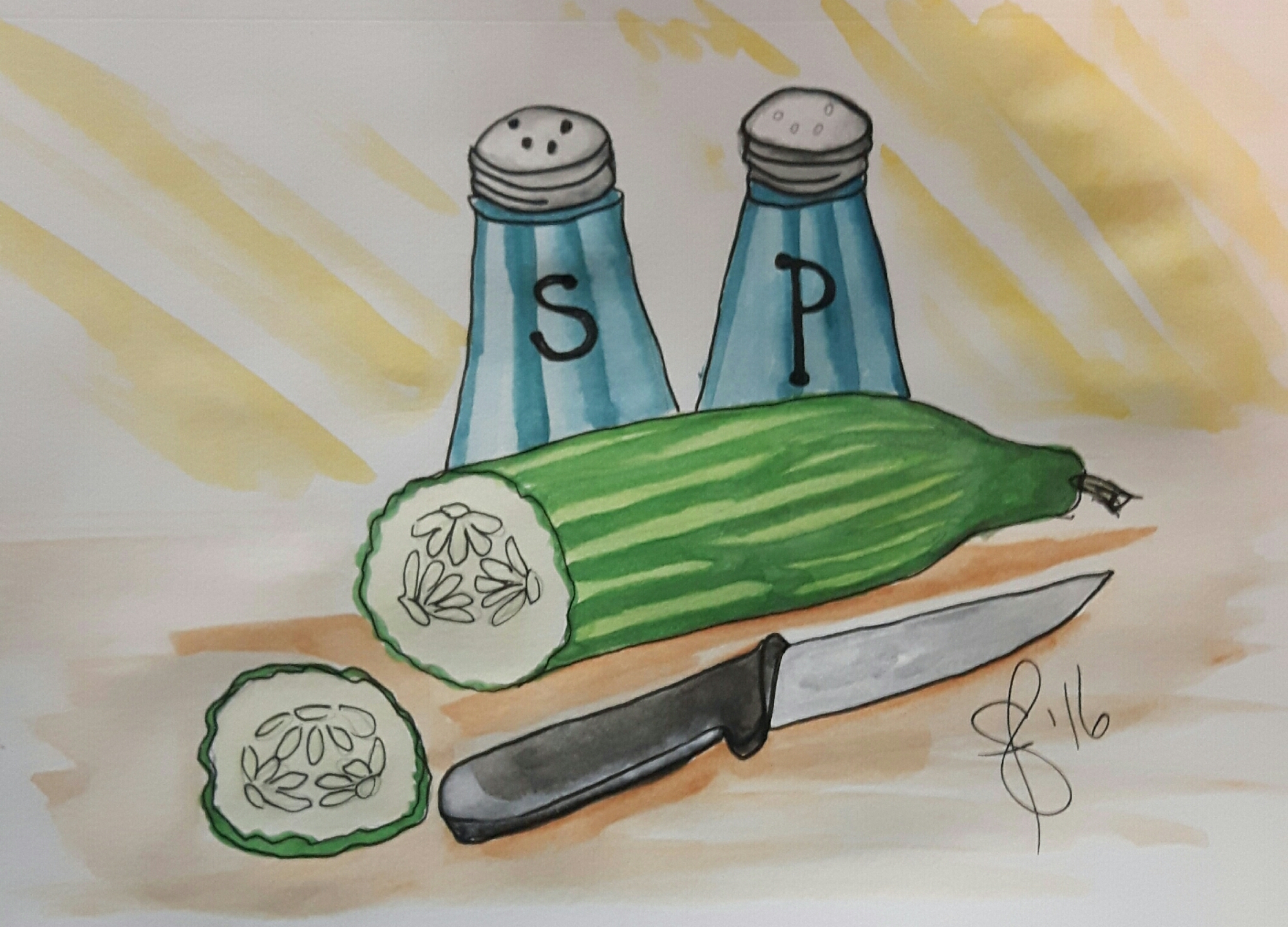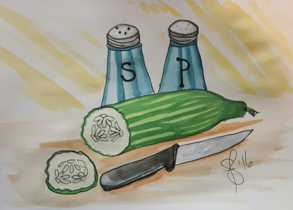 Posted: November 3, 2016 Filed under: #WorldWatercolorGroup, Just for fun, Sketch book, Sketches/Doodles, Susan Feniak Originals | Tags: #WorldWatercolorGroup, Holbein Watercolors, Just for fun, Sketches/Doodles, Susan Feniak Original Art 8 CommentsThe prompt for November 3 is sandwiches . Here I am waiting for some sliced bread to go with my cucumber salt and pepper. That’s my second favourite sandwich . Peanut butter and honey or jam is still my go to and always has been. Enjoy your Thursday . PEACE