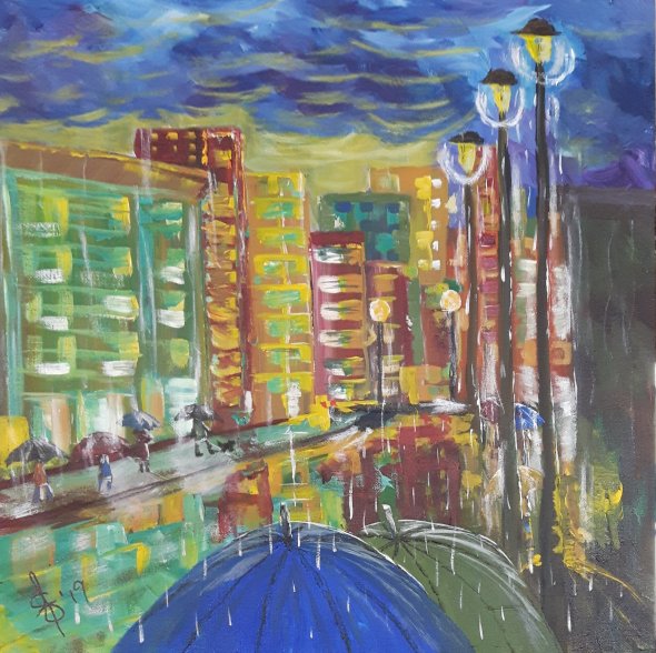 Hurry Home! This one is drying on my easel. I wanted to do something a bit different. It certainly was fun to do. Who knew a rainy city night could be fun? I had the idea rumbling around in my imagination for awhile. Putting it all on canvas was the next trick. Hope you like it. Acrylic on 20″ x 20″ x 1.5″ thick canvas painted on all sides. No frame needed. $250.00