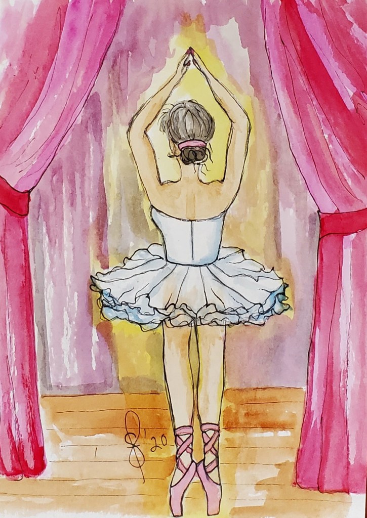 World Watercolor Month Day 11 Prompt “Round”. For some reason this prompt got me thinking about how ballerinas twirl, spin and pirouette. So here she is doing her thing. I am always somewhat amazed how a ballerina can do all that twirling, spinning and pirouetting on her tippy toes. And with so much graceful elegance. My ballerina is QoR watercolors and Pixma Micron ink on a Strathmore card. To find out more about World Watercolor Month please visit worldwatercolormonth.com Thank you.