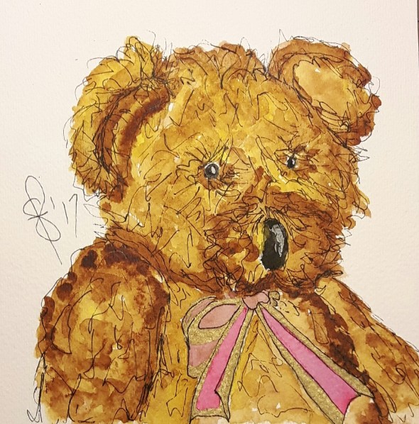 Posted: May 17, 2017 Filed under: #cancersurvivor, #WorldWatercolorGroup, QOR water color, Sketches/Doodles, Strathmore Paper, Susan Feniak Originals | Tags: #cancersurvivor, #WorldWatercolorGroup, QOR water color, Sketches and Doodles, Strathmore Watercolor Paper, Susan Feniak Original Art 16 Comments“Fuzzy” the prompt for May 17. Fuzzy wuzzy wuz a bear! This is actually my bear, Fitsimmons. He was one of my care givers, greatest listener and keeper of secrets during my cancer treatments. We have been buddies for 21 years now and been threw alot together. A dear bear deserving of a portrait. I hope I did him justice. Original art by Susan Feniak. QOR water color on Strathmore Paper.