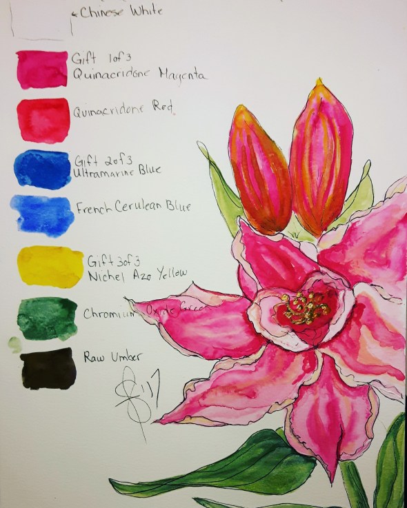 Posted: May 5, 2017 Filed under: #WorldWatercolorGroup, Canson Aquarelle, Paintings of Flowers, QOR water color, Sketch book, Susan Feniak Originals | Tags: #WorldWatercolorGroup, Canson Aquarelle paper, Just for fun, QOR water color, sketch book, Sketches of Flowers or Plants, Susan Feniak Original Art 13 CommentsIt’s official I am going to love my new QOR water colors. Made by Golden. I bought 6 basic colors. The cadmium Yellow is on back order. Because there was an awesome sale on at Opus, I also received 3 free tubes. You can see the results in my first quick painting using only the magenta, Chinese white, oxide green and nickel azo yellow. I will be sharing more…. Original art by Susan Feniak. QOR water color on Canson Aquarelle paper. I am saving the new hot press Arches for special paintings. #worldwatercolorgroup