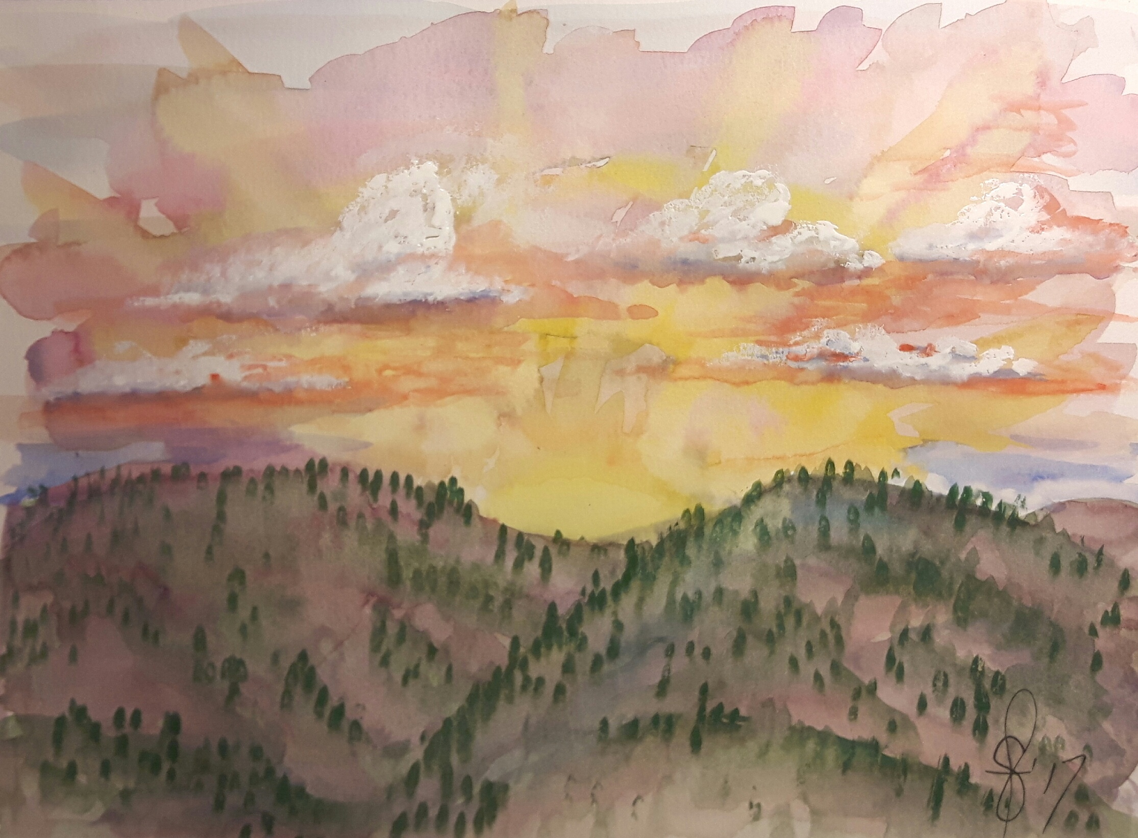 Posted: July 5, 2017 Filed under: #WorldWatercolorGroup, #Worldwatercolormonth, Canson Aquarelle, Sketch book, Susan Feniak Originals | Tags: #WorldWatercolorGroup, #Worldwatercolormonth, QOR water colours, Salmon Arm, Sketches/Doodles, Susan Feniak Original Art 6 CommentsJuly 5th Part of the view from our house. The sky looks like this on some summer evenings as the sun disappears behind the hills. Original art by Susan Feniak. QOR water color on Canson Aquarelle paper.