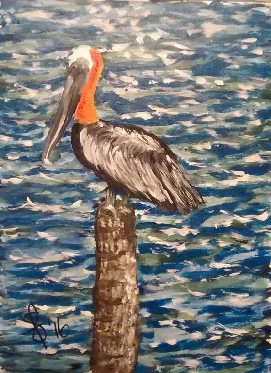 My first painting of 2016! Being in need of some sunshine and warmth I recalled this scene from our trip to Belize last winter. I came across these Pelicans “All In A Row” while riding my bike around Caye Caulker. The Pelicans are no doubt resting after feeding on the catch of the day or perhaps they are waiting for the next fishing boat to come in. Maybe they are just sunning themselves. Whatever they are doing the scene brought back fond memories and that feeling of sunshine and warmth that I needed.