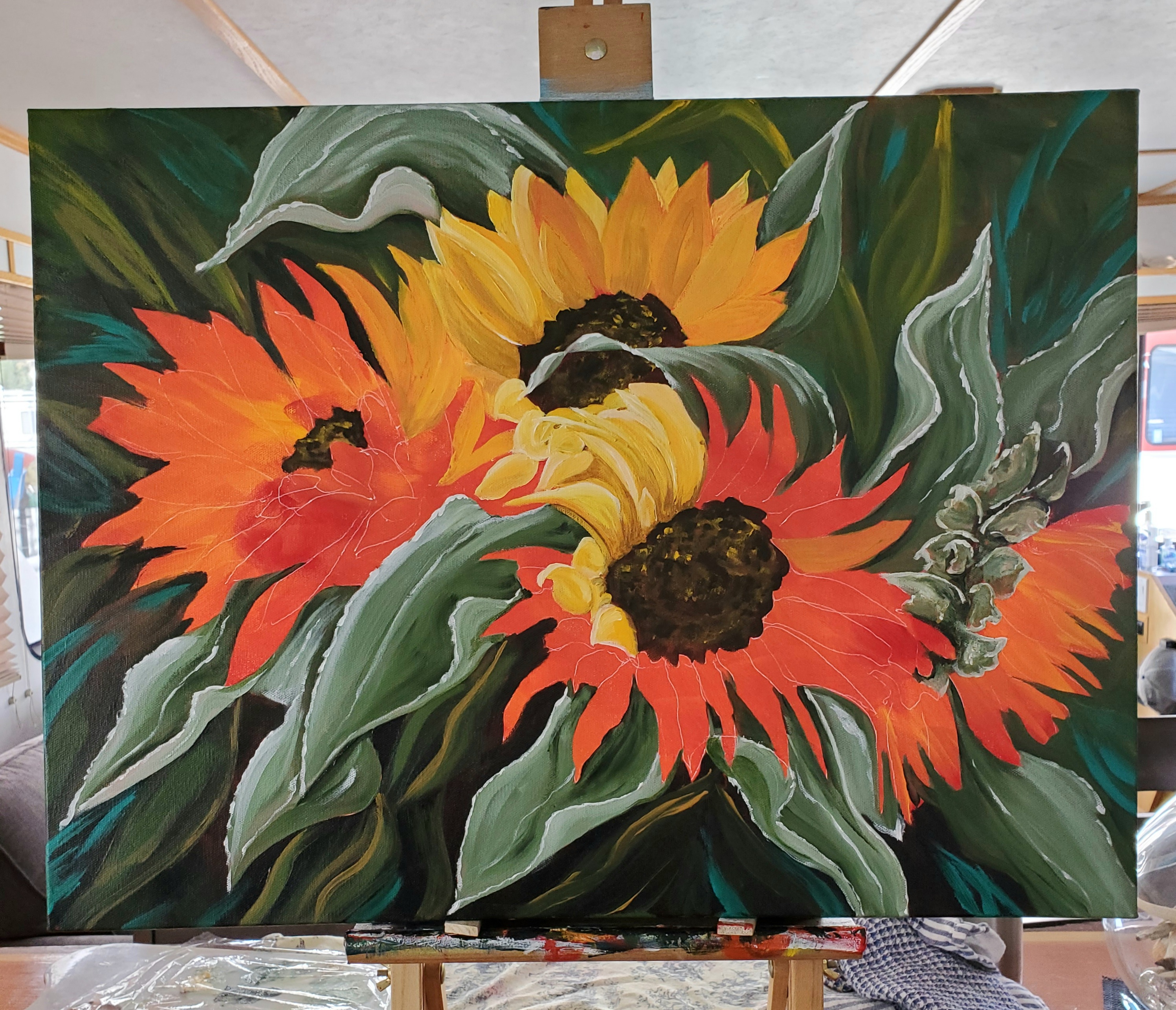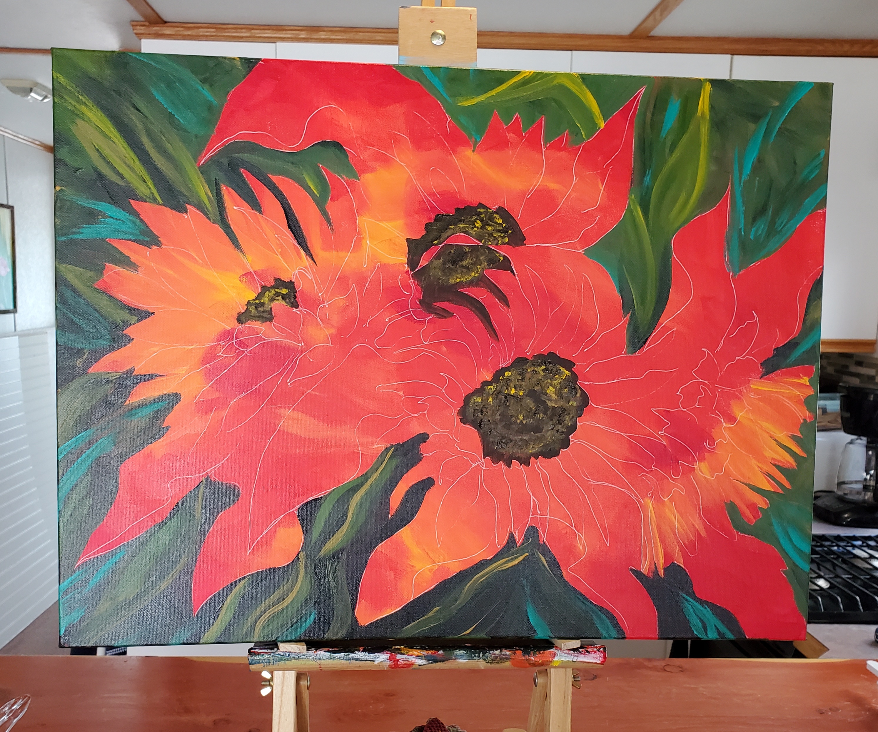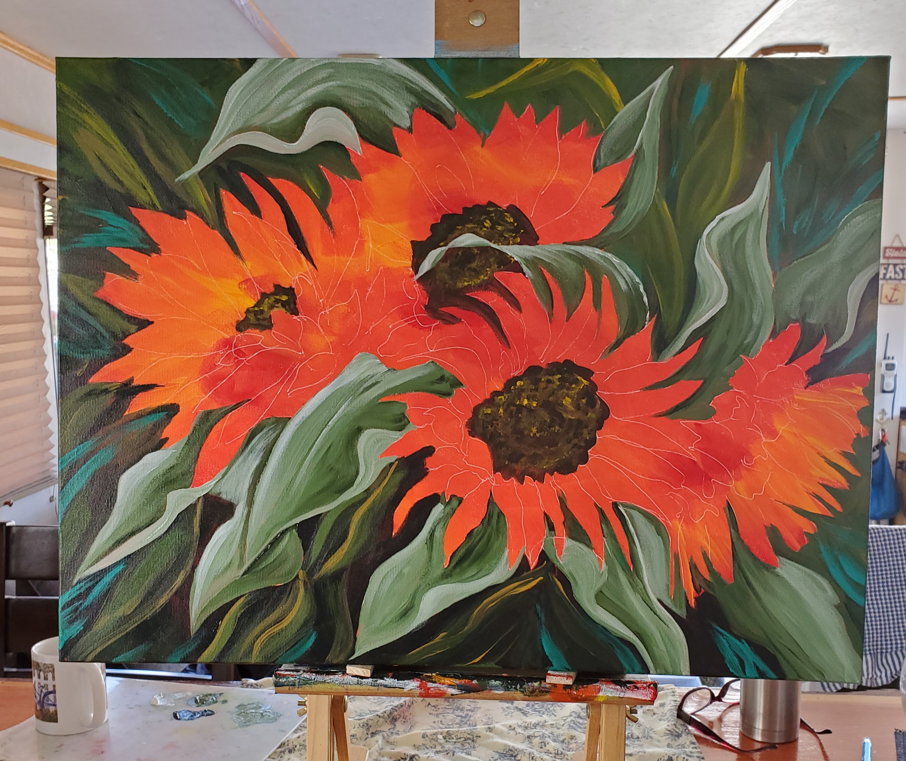 Posted: September 13, 2021 Filed under: Acrylic on Canvas, Acrylic Paintings, Canadian Artist, Gardening/Flowers, Golden Acrylics, Golden Artist Colors, In progress, Opus Art Supplies, Original art, Paintings of Flowers, self taught artist, Shuswap Artist, Susan Feniak art, Susan Feniak Originals, Susan Feniaks Easel, Uncategorized, WIP | Tags: #canadianartist, #shuswapartist, Acrylic on canvas, Canadian Artist, Flowers, For the joy of it, Golden Acrylics, Golden Acrylics on Canvas, Golden Artist Colors, In progress, Opus Art Supplies, original art, Paintings of Flowers, self taught artist, Shuswap Artist, Susan Feniak art, Susan Feniak Original Art, Susan Feniak Acrylic, WIP 2 CommentsI had so much fun creating my last painting that I decided to do another floral piece. It helps that I have a beautiful bunch of sunflowers sitting on our table to inspire me. After this, I think that I will be finished with florals for awhile. It will be time for something else. I hope you enjoy my progress reports….