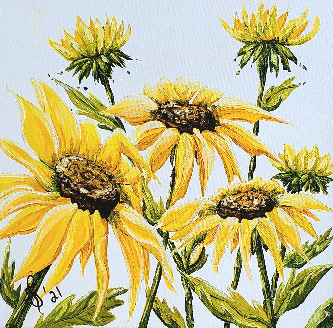 Posted: August 26, 2021 Filed under: Acrylic on Canvas, Acrylic Paintings, Canadian Artist, Golden Acrylics, Golden Artist Colors, Just for fun, Original art, Paintings of Flowers, self taught artist, Sold Art, Susan Feniak art, Susan Feniak Originals, Susan Feniaks Easel, Uncategorized, Whimsy | Tags: #canadianartist, #shuswapartist, Acrylic on canvas, Canadian Artist, Flowers, For the joy of it, Golden Acrylics, Golden Acrylics on Canvas, Golden Artist Colors, Paintings from the garden, Paintings of Flowers, self taught artist, Shuswap Artist, Sold Art, Susan Feniak art, Susan Feniak Original Art, Susan Feniak Acrylic 6 CommentsJust finished another 10″ x 10″ painting. Small by my standard. These are the progress photos and the final painting. I decided to leave the background white. Maybe it’s the start of a new trend? The title is “Yellow Maze”. If you were interested in purchasing this painting you are too late as it SOLD almost immediately. Thank you to the purchaser. Selling art has been a tuff slog this summer as venues have been few and far between. I am fortunate to have sold anything. As always I am grateful to have someone like my art enough to hang in their home and personal space. Cheers Susan