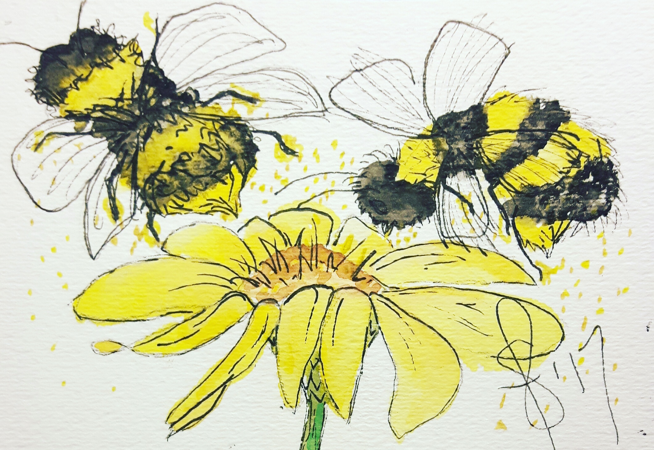 Posted: April 12, 2017 Filed under: #WorldWatercolorGroup, Holbein Water Colors, Just for fun, Sketches/Doodles, Susan Feniak art, Susan Feniak Originals | Tags: #WorldWatercolorGroup, Holbein Watercolors, Just because, Sketches and Doodles, Susan Feniak Original Art 12 Comments“Bees” original art by Susan Feniak. The prompt today March 12th was Bees. I went with the far cuter non stinging variety, Bumblebees. Fuzzy and often seemingly drunken in appearance. They are usually over loaded by the pollen they have so busily been collecting. A sure sign of spring! Buzz….. Hopefully there is progress being made in the salvation of the world’s honey bee population.