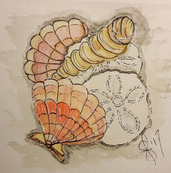 Posted: July 3, 2017 Filed under: #Worldwatercolormonth, Holbein Water Colors, Just for fun, Seaside, Sketches/Doodles, Susan Feniak Originals | Tags: #WorldWatercolorGroup, #Worldwatercolormonth, Seaside, Sketches/Doodles, Susan Feniak Original Art 6 CommentsJuly 3rd. I love seashells and have a nice collection from wherever we go. My favourite would have to be the large conch from Belize. Since I have all ready done a painting of it I give you this assortment. Rather quickly done, original art by Susan Feniak. Holbein Artists water colors on Strathmore Paper. 6″×6″