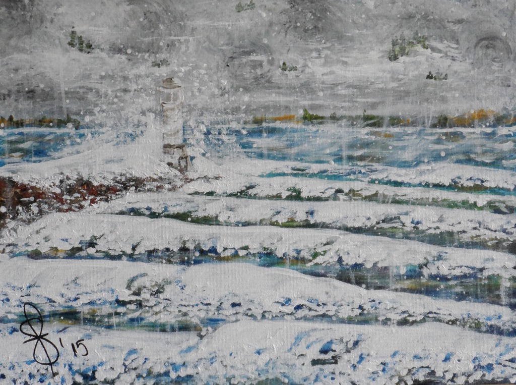 A reminder that neither our lake or all our boating experiences are calm, peaceful and relaxing. Our lovely Shuswap Lake can turn on you in a heart beat. Every summer we ride out several of these storms. Last summer there were some dandy blows! We have witnessed the wind change direction at least six times in under an hour. The waves can come crashing in from any direction on top of one another. Daunting. The channel marker is obliterated by the storm breakers and spray. Lightening, thunder everything can be thrown at us lowly boaters. Sheets of rain or even hail can pound down. Visibility is nil, zero, nadda. It all leaves one wondering what’s coming next? Fortunately storms on the Shuswap are short lived. Soon the adrenalin rush has passed leaving in its wake another Shuswap boating experience to share and talk about for days to come. Of course one never has time to grab a camera when they are bouncing around on a dock or boat or watching safely from shore so this painting is from memory. Hope you enjoy the experience!! Cheers Susan