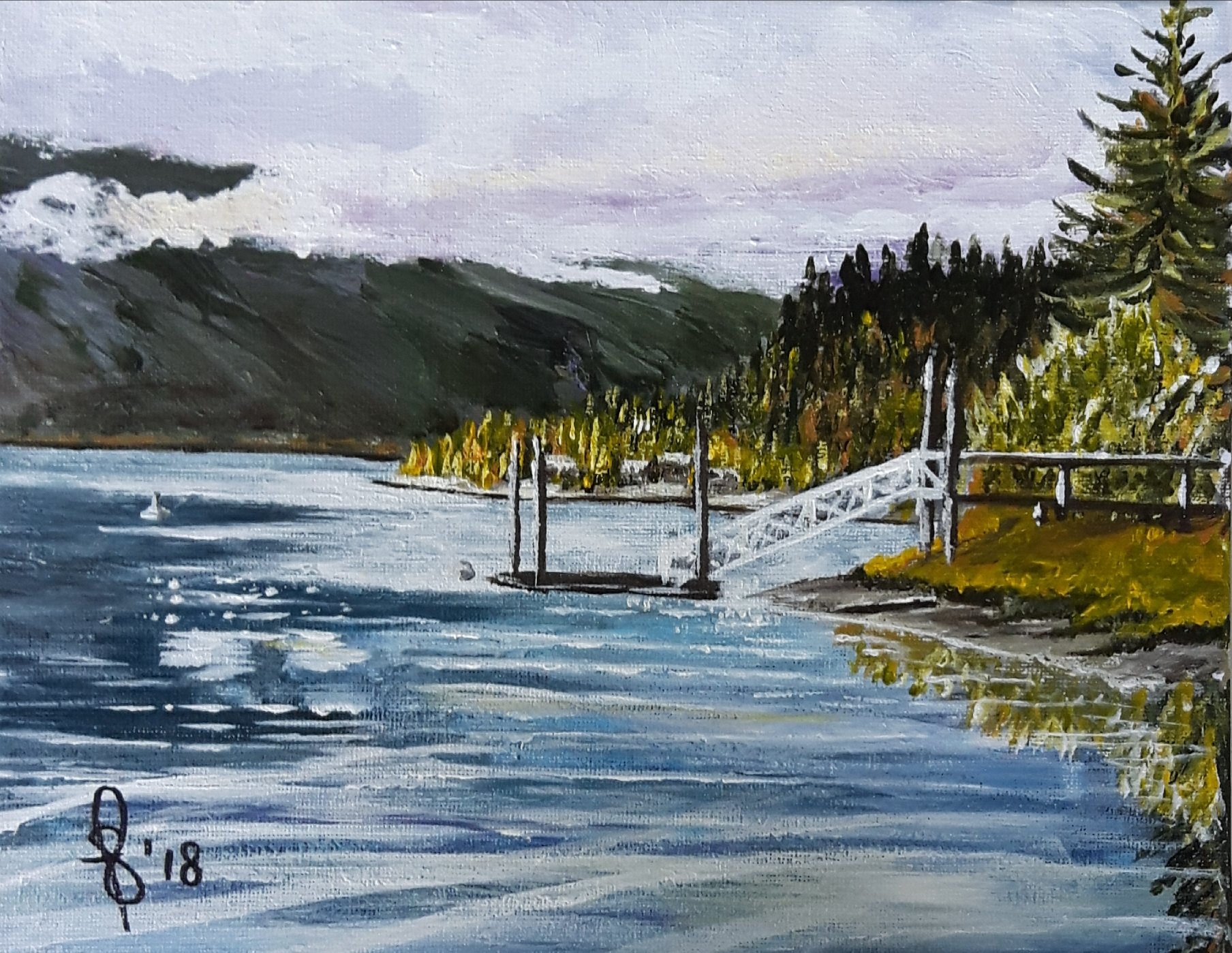 My latest painting “Hyde to Mara”, is DONE! This painting is based on a photo I took last summer. Lunch at the Hyde Mountain golf course includes this idyllic view of Mara Lake in beautiful British Columbia. Playing golf is not for me but I will gladly enjoy lunch at the golf course just to partake of the views from many vantage points. I have been wanting to capture this particular view on canvas for some time. I hope I have done it some justice.