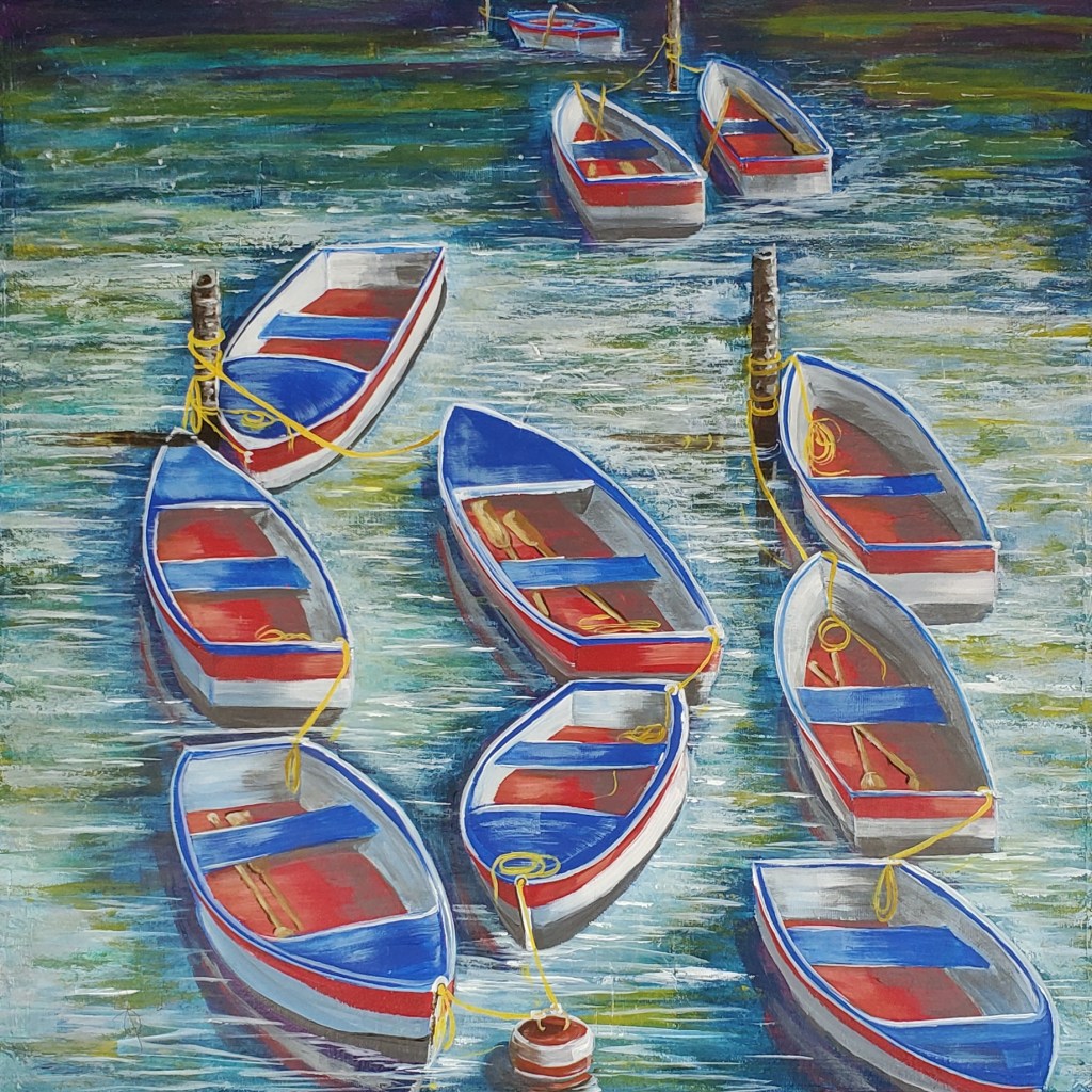 “Flat Bottom Gals” is my latest acrylic painting on a 20″ x 20″ gallery canvas. A string of boats waiting for hire. Colorful, bright and cheerful. Hard to resist. I couldn’t resist the name I gave to this painting either. It’s fun too. We can all use a bit of happy these days. Right?