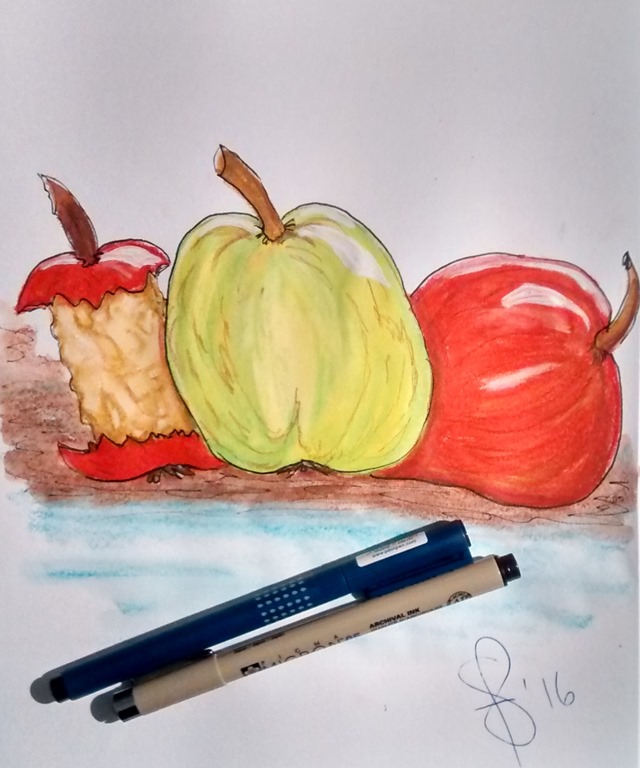 Posted: May 3, 2016 Filed under: #DoodlewashDinner, Just for fun, Neocolor Caran D'Ache Water Color Crayons, Neocolors, Sketch book, Sketches/Doodles, Susan Feniak art, Susan Feniak Originals, Uncategorized | Tags: #DoodlewashDinner, Just for fun, Neocolor Caran D'Ache, Neocolors, sketch book, Sketches/Doodles, Susan Feniak Original Art 20 CommentsFor the love of Apples! Whether they are a delicious Granny Smith or a scrumptious Royal Gala they are a part of my everyday lunch time meal. As you can tell in this doodlewash I couldn’t wait to eat one of the apples! So much for my props!
