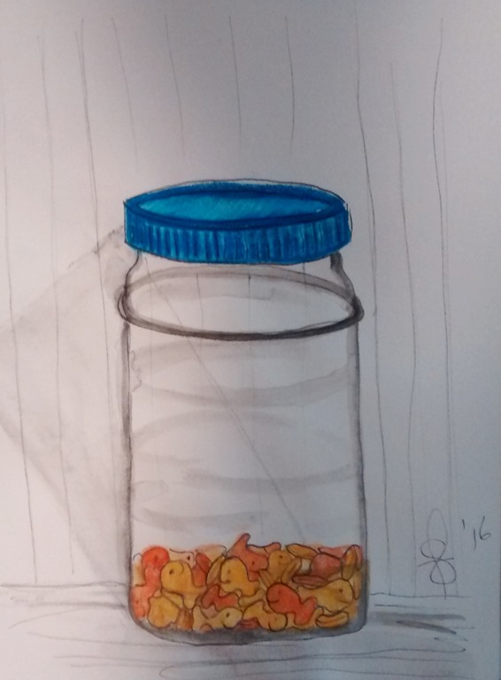 Posted: April 18, 2016 Filed under: #doodlewashaday, Just for fun, Neocolor Caran D'Ache Water Color Crayons, Neocolors, Sketch book, Sketches/Doodles, Susan Feniak Originals, Uncategorized | Tags: #doodlewashaday, Just for fun, Neocolor Caran D'Ache, Neocolors, sketch book, Sketches/Doodles, Susan Feniak Original Art 19 CommentsApril 18th is National Animal Cracker Day. I know that isn’t animal crackers in the jar! At this Grandma’s house the Grandkidlets prefer Goldfish Crackers. So that is what I doodlewashed. I keep the goldfish in an old plastic peanut butter container on a shelf in the pantry exactly where it should be kept full and at the ready. Its obvious by the look of the jar that I need to go shopping! At the moment its the multi cheese version in the jar. To keep things a bit on the healthier side they are often doled out with raisins, dried cranberries or dried blueberries. But sometimes chocolate chips make it into the mix and that brings on big smiles!