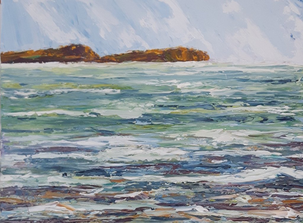 I have made a good start to another seascape. It has become apparent to me that I am happiest painting larger pieces and water. This after trying to increase my small pieces inventory. I will finish this one and get back to the smaller works. Having a good variety to share with everyone is important, collectors, purchasers, venues and all.