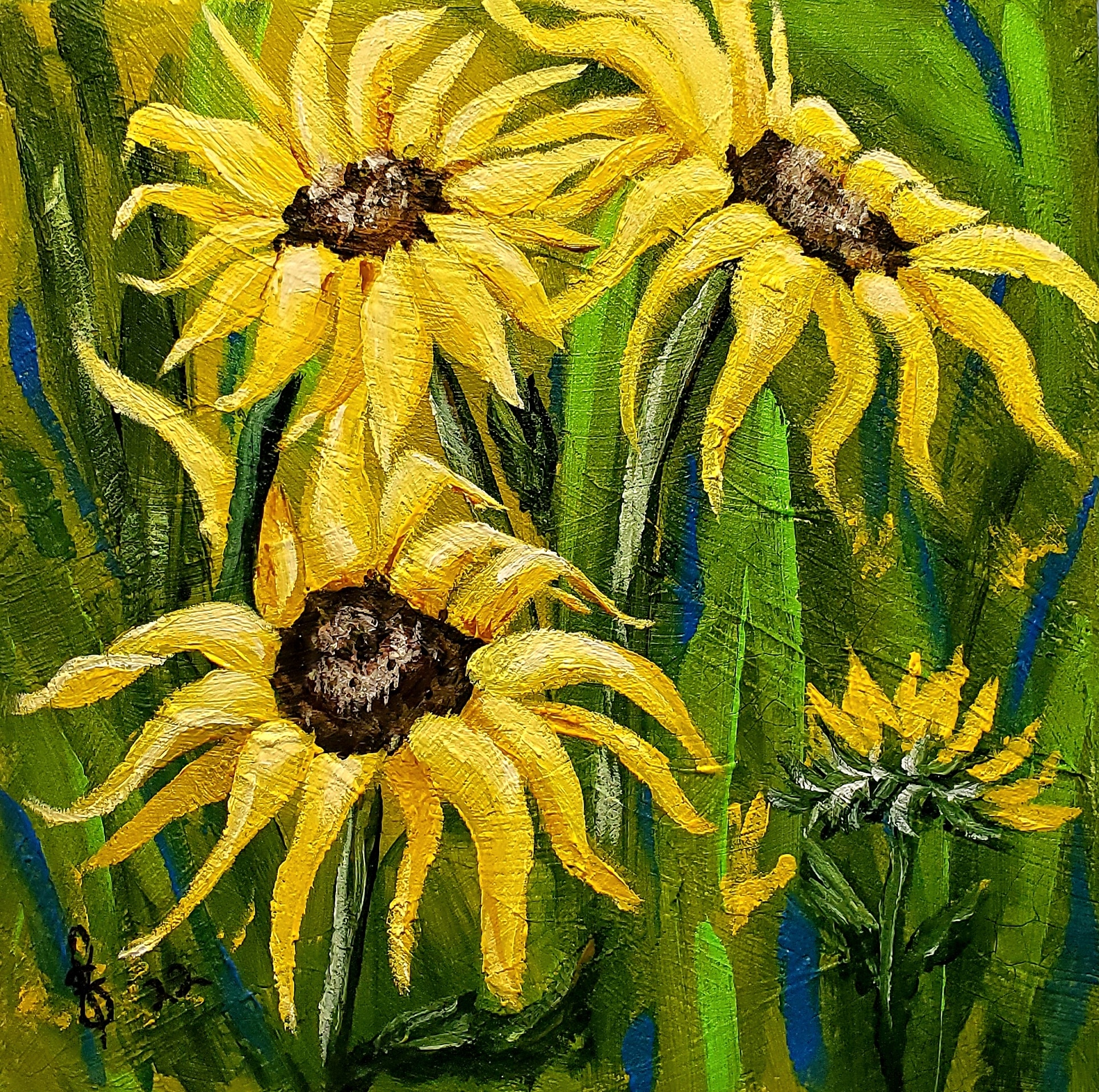 Recently I have been working on smaller projects. Being able to offer up various sizes and prices is important. All are acrylic on canvas board with the exception of my sunflowers for Ukraine it’s acrylic on a 10″ x 10″ gallery canvas, painted on all sides. Prices range from $30 to $45 cdn.
