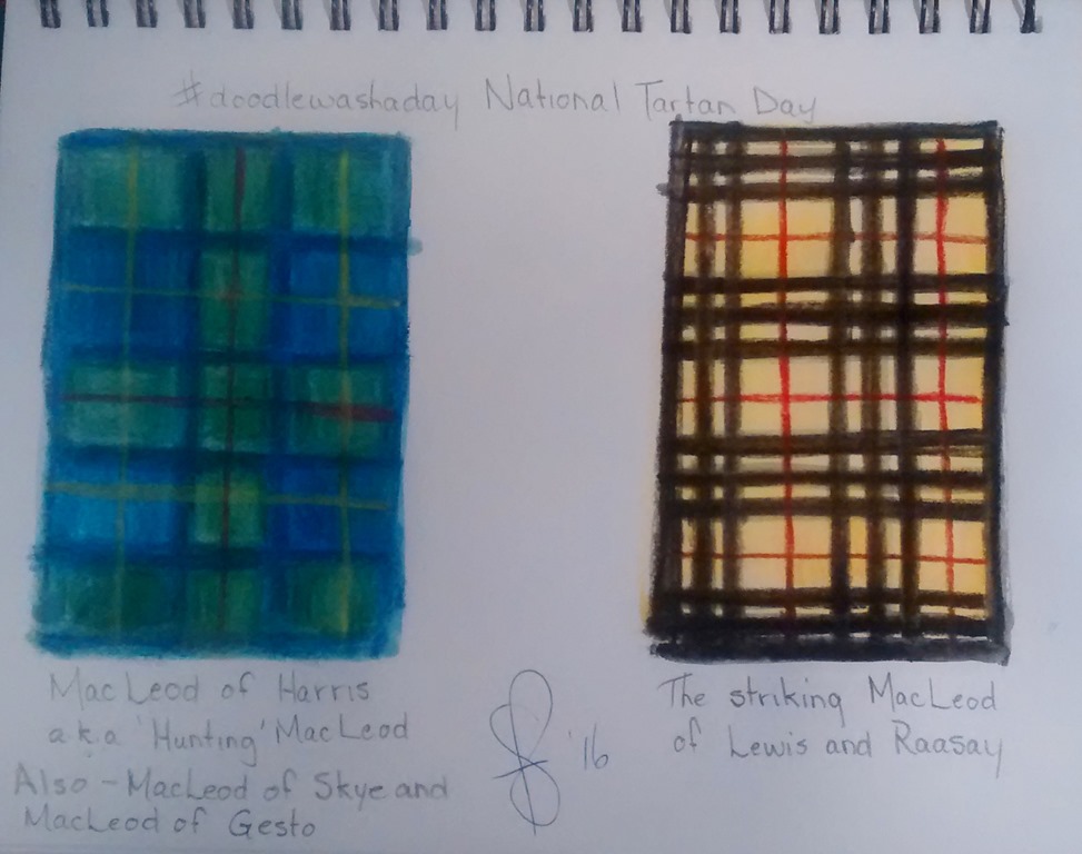 Posted: April 6, 2016 Filed under: #doodlewashaday, Just for fun, Neocolor Caran D'Ache Water Color Crayons, Neocolors, Scotland, Sketch book, Sketches/Doodles, Uncategorized | Tags: #doodlewashaday, Just for fun, Neocolor Caran D'Ache, Neocolors, sketch book, Sketches/Doodles 12 CommentsApril 6th brings National Tartan Day, or, and I quote, “National Sorry Charlie Day”. Sorry Charlie but I opted for Tartan. Since my ancestors are mainly from Scotland and Ireland and I have been to Scotland three times I have a bit of an affinity with tartans. Here I have doodlewashed two of my ancestral Clan MacLeod tartans, MacLeod of Harris and MacLeod of Lewis and Raasay. My favourite would be MacLeod of Skye. I could go on about Scotland but I will spare you.