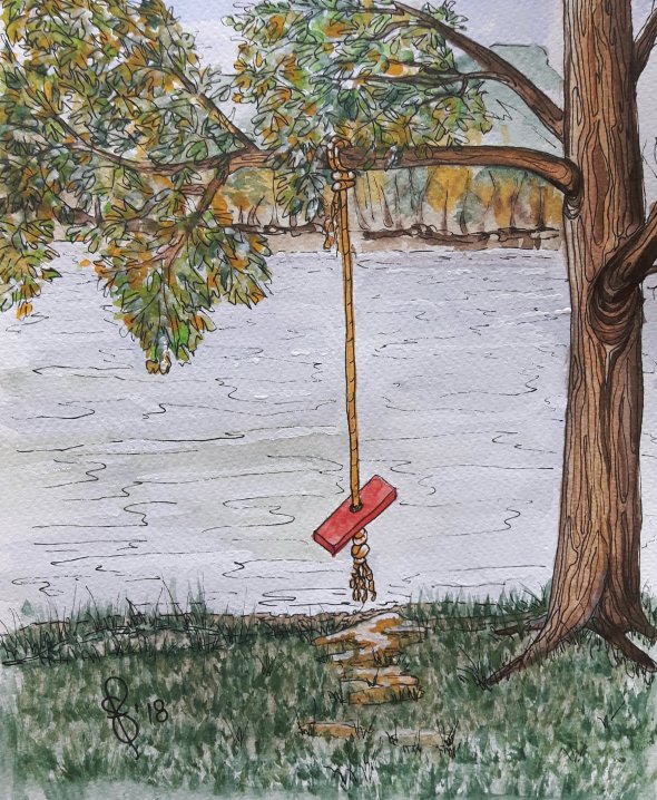 I can imagine grabbing onto that rope, swing out over the water, and jump! How exhilarating! I better wait until summer to have a go. You are never too old to have a little fun. Artist Susan Feniak. Daniel Smith Extra Fine Watercolors on Fabriano cold press paper. 8″×10″.