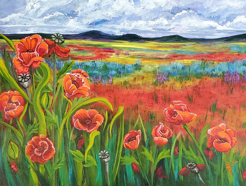 New art completed! Title, “Radiant Vista”. Who can resist a meadow of wild flowers? I couldn’t. Poppies are always a popular subject. At least they are for me. Over the years I have painted several pieces that focus on the venerable and colorful poppy. I hope you enjoy my latest version.