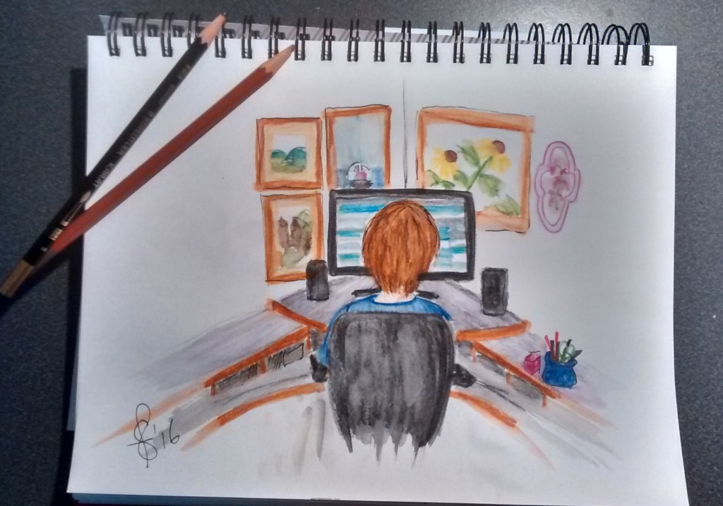 Posted: January 24, 2016 Filed under: #SelfieArt, Sketch book, Sketches/Doodles, Uncategorized, Water color pencils | Tags: #SelfieArt, sketch book, Sketches/Doodles, water colour pencils 11 Commentsoriginal sketch by Susan Feniak ,water colour pencils on paper. It will be the 25th day of the month tomorrow and time for #SelfieArt. Since I haven’t heard or read otherwise I am assuming it is that time again. I will be hard at work tomorrow so I thought it best to post my attempt today. It is a very quick sketch of me at my desk. Because my office/studio is in our basement I have surrounded myself by favourite art, pictures, photos, antique plates and a bulletin board along with everything else that is colourful and enjoyable to me. It all makes for a more pleasant working environment. Much better then just a computer screen, calculator, printer/scanner, files, papers, and other paraphernalia that a bookkeeper needs. Oops I better adjust all the paintings that have gotten crooked! Even the 2016 Calendar isn’t hanging straight! Oh and for those not in the know, January 25th is also Robbie Burns Day!!