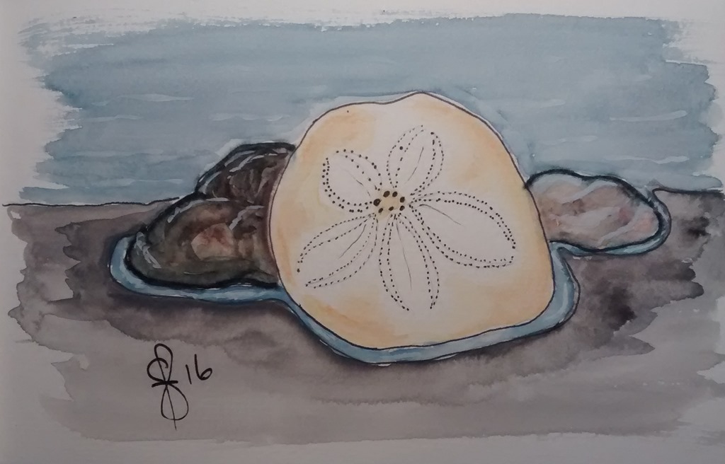 Posted: June 15, 2016 Filed under: #NatureDoodlewash, Elegant Writer, Holbein Artists' Water Color, Just for fun, Seaside, Sketch book, Sketches/Doodles, Susan Feniak art, Susan Feniak Originals, Uncategorized, Water color pencils | Tags: #NatureDoodlewash, Elegant Writer, Holbein Watercolors, Just for fun, Seaside, sketch book, Sketches/Doodles, Susan Feniak Original Art, water color pencils, water colors 18 CommentsJune 15 Today we will go for another walk along the sea shore. No we are not going to the Caribbean today. Instead we are going to a beach on the west coast of British Columbia. There is lots to see here too. Natures beauty abounds. Perchance we will come across a sand dollar. A sand dollar is a burrowing form of a flat sea urchin. Did you know if you find one they are good luck? Today we have come across one that has washed up along the shore and has turned white. A live sand dollar will be darker, brownish black or purple. So we can pick this one up and take it home. A lovely memory from our walk today.