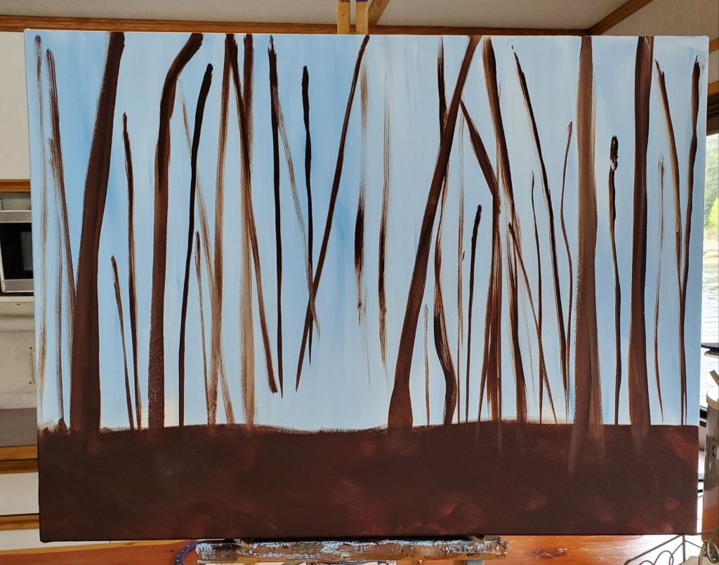 I am making progress on my latest painting. These are photos of my process. FYI I start with a totally blank, white, pristine canvas. Sometimes that is daunting in of itself. I seem to be detail oriented these days. Not to mention enjoying creating trees and embracing nature.