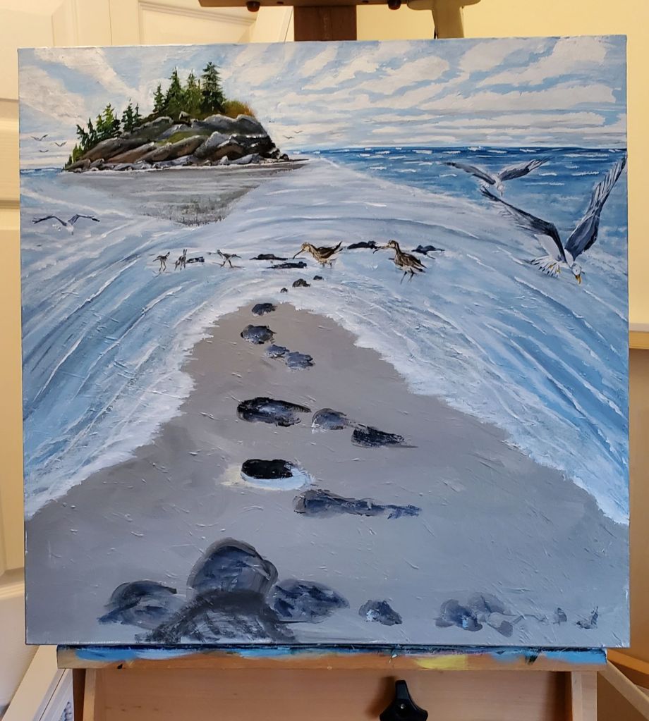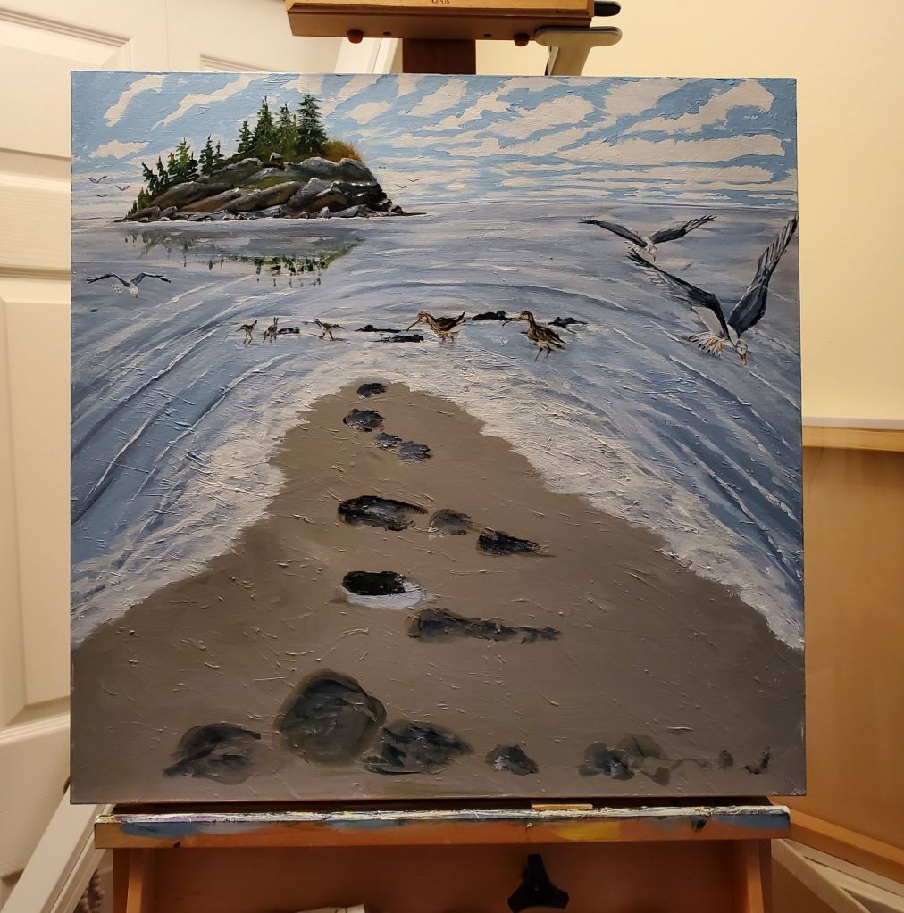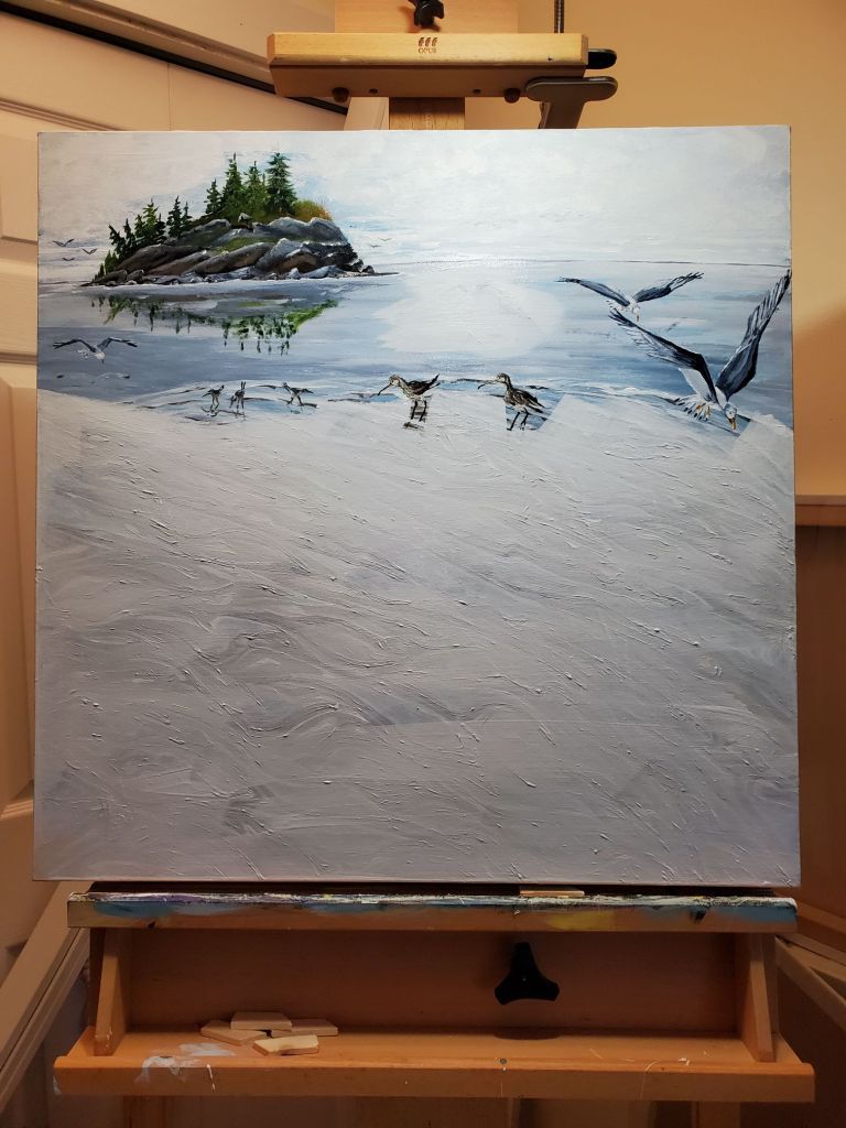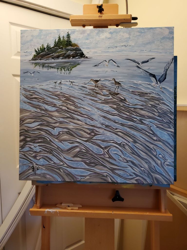 My husband says the sand bar looks like it’s pushing the water. Oh oh. That doesn’t sound good. It’s supposed to be the other way around with the water pushing and surrounding the sand bar. What do you think? All that being said the painting/revision is still a work in progress. Time will tell…..