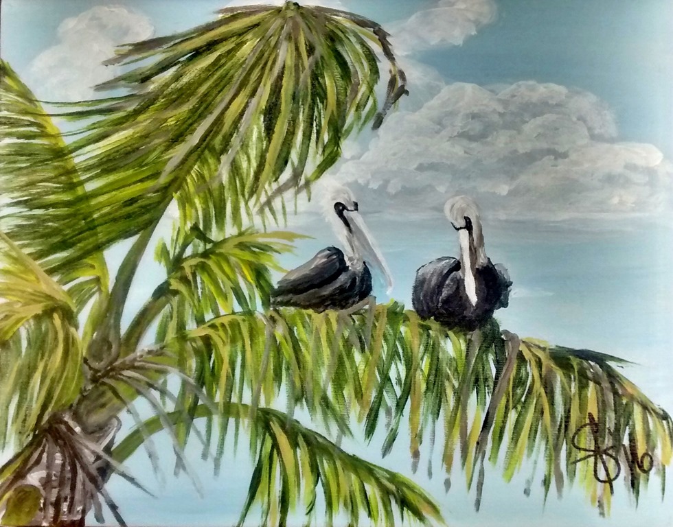 I was going to save this one for April’s Draw A Bird Day but decided to post it now. I can always paint another one right? These two brown pelicans sat in that palm tree keeping my husband company while I was off snorkeling at Silk Caye, Belize. There is a grand total of five palm trees on the wee atoll of Silk Caye, two picnic tables, an outhouse, a couple of barbecues and a lot of pelicans waiting and watching. There really isn’t much for a patient husband to do but wait and watch along with the pelicans. I truly enjoyed my snorkel adventure! My husband? Perhaps not so much.