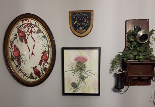 “Cardinal Wreath”. Artist Susan Feniak. Watercolor and ink on Arches paper. A Merry Christmas to me painting. A friend gave me the antique frame a year or two ago and it’s taken me this long to decide what I wanted to create to put in the frame. The end result has added to my Christmas decor nicely. A keeper!