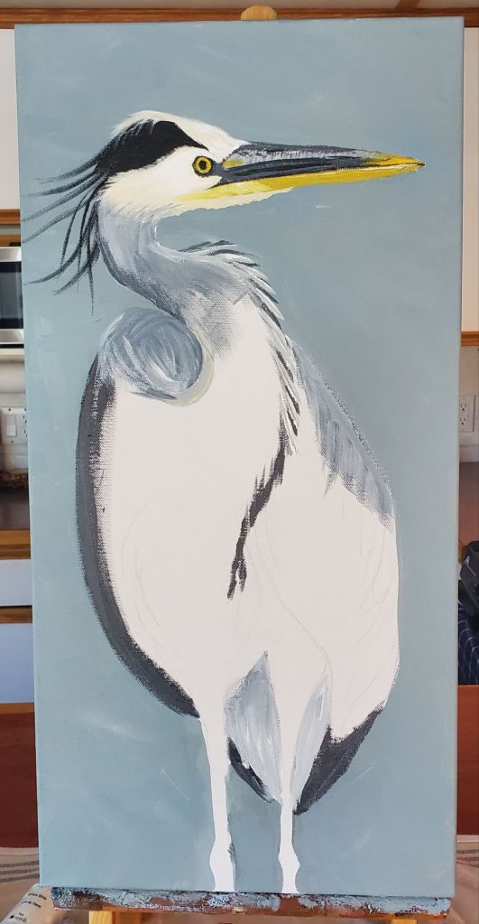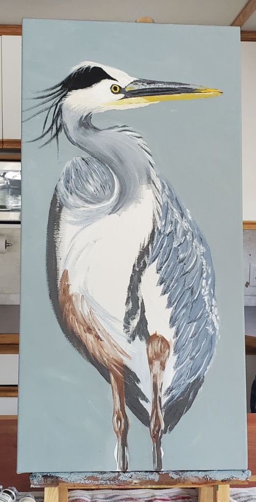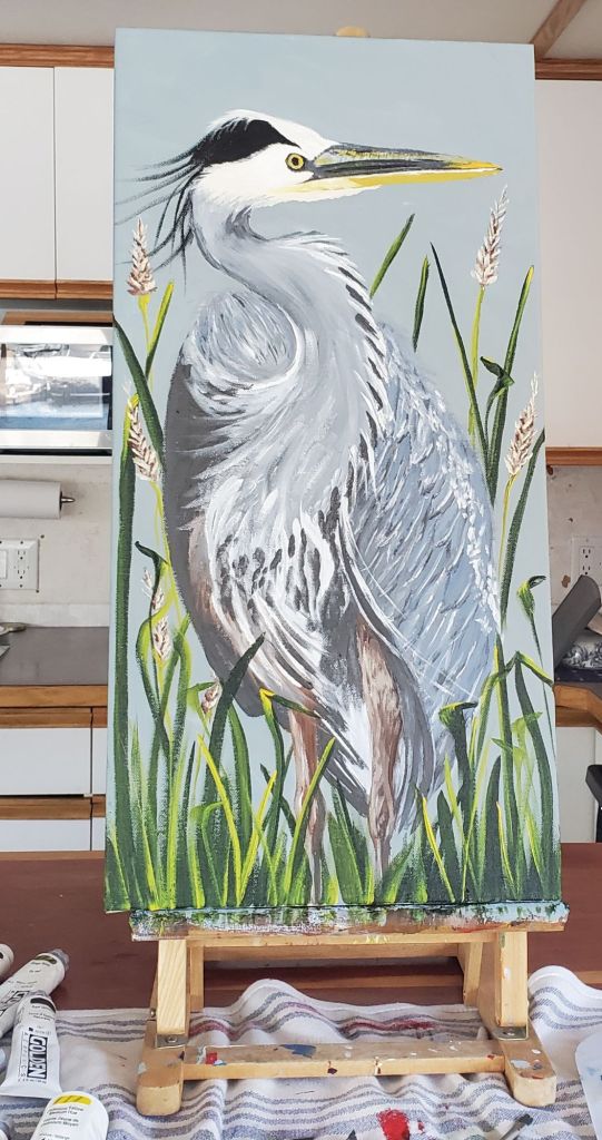 “Mr. Heron” is acrylic on a 12″ x 24″ gallery canvas. SOLD 🔴 Asking $200.00 cdn plus shipping. Artist Susan Feniak.