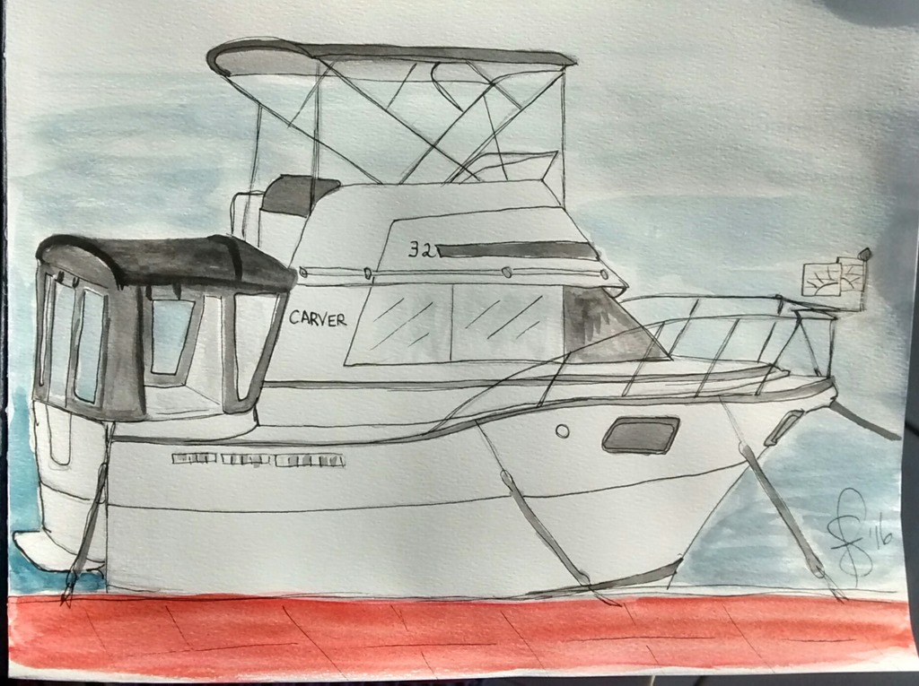 Posted: June 5, 2016 Filed under: #doodlewash, Just for fun, Paintings of boats, Shuswap Lake, Sketch book, Sketches/Doodles, Susan Feniak Originals, Uncategorized, Watercolors | Tags: #doodlewash, Boating, Just for fun, Paintings of boats, Shuswap Art, sketch book, Sketches/Doodles, Susan Feniak Original Art, water colors 25 CommentsAnother weekend of boating enjoyed. While hubby naps I get time for art. Here I have sketched our girl (ours is the black and white one) and one of the boats tied up across from us at the marina. Lots of challenging angles and curves to tackle not to mention perspective. Hope you are enjoying your weekend. Cheers Susan