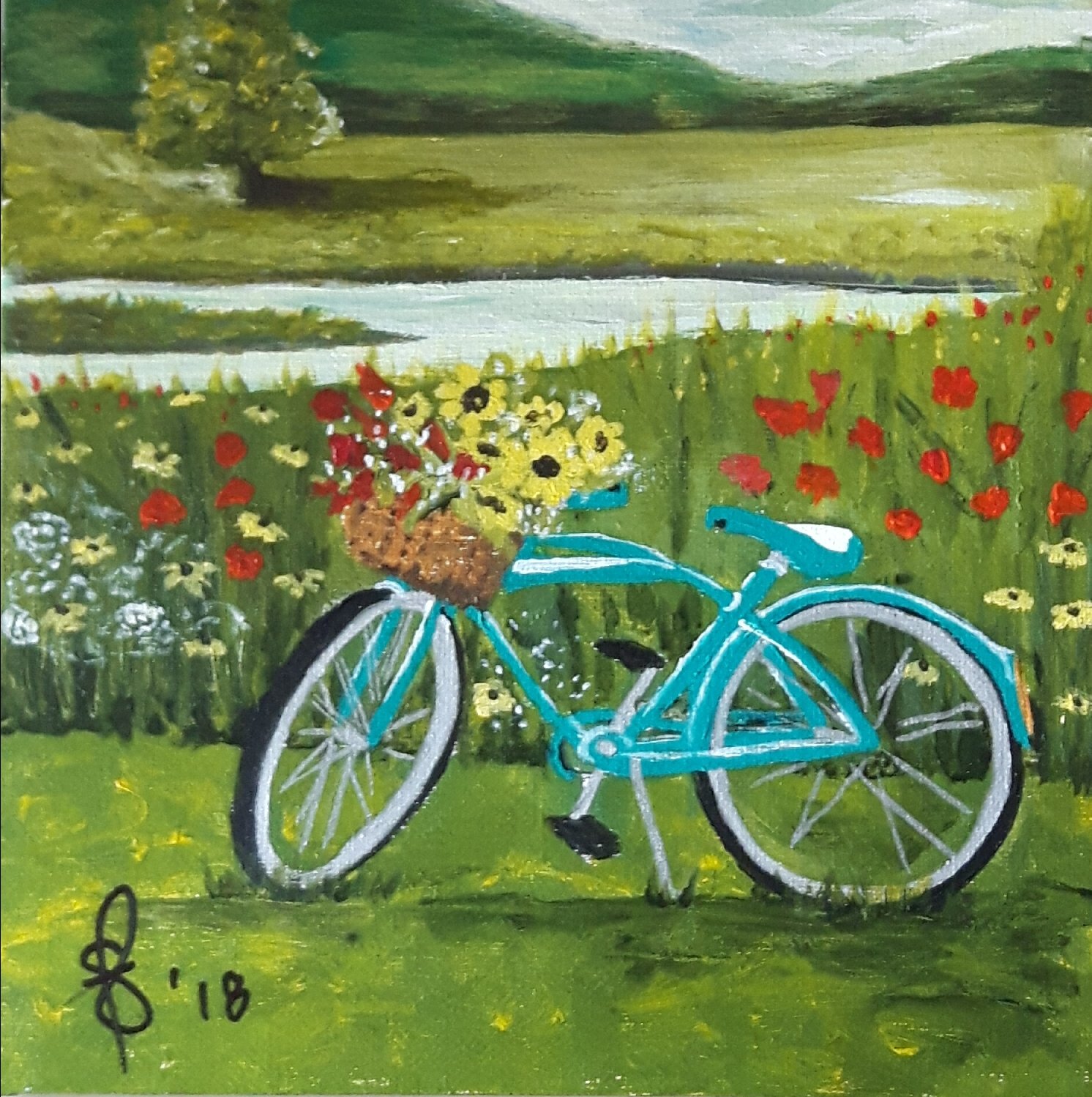 Posted: August 20, 2018 Filed under: Acrylic on Canvas, Acrylic Paintings, Golden Acrylics, Just for fun, Landscapes, Original art, Paintings of bicycles, Susan Feniak art, Susan Feniak Originals, Uncategorized, Whimsy | Tags: Acrylic on canvas, Country Art, For the joy of it, Golden Acrylics, Golden Acrylics on Canvas, Golden Artist Colors, landscapes, Paintings of bicycles, Susan Feniak art, Susan Feniak Original Art, Susan Feniak Acrylic, Whimsy 8 CommentsSuch a long title for a small painting. Artist Susan Feniak. Golden Artist Colors on 8″ × 8″ canvas board. Found these nice little canvases in a plain wood frame. I have painted the frame the same color as the bike. Wishing I had bought more of them. Happy Monday!