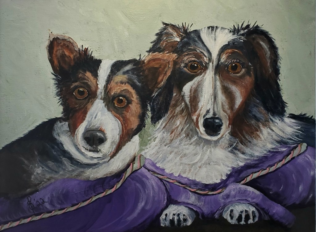 “Best Buddies”. My latest acrylic on canvas painting. I hadn’t painted a larger doggie painting until now. My usual animal creations are normally done with watercolors. Milo and Molly are from my imagination. Yes, I gave them names, but I will let you decide who is who. I hope you like them.