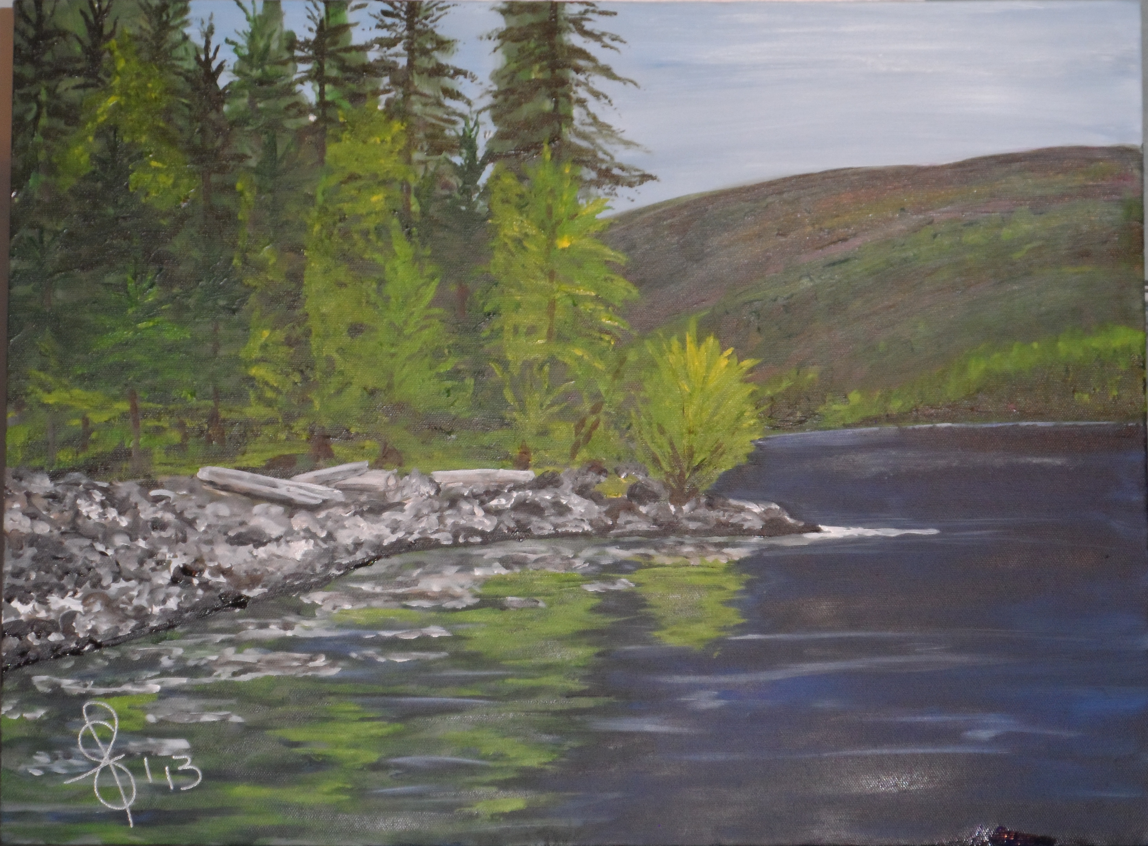 This is a painting of the Eagle River. The river meanders threw the Eagle Valley and drains into Shuswap Lake. This is where I live. Eagle River moves rather slowly or lazily on a hot summers day. A different story come spring run off. On this summers day when I took the photo the reflections and surrounding scenery were inspiring. Who couldn’t resist taking photos or painting an image? The canvas itself is a bit of an odd size and has been sitting in my stock pile for awhile now waiting for this opportunity.
