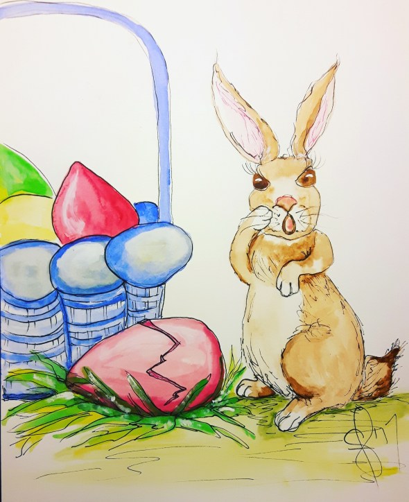Posted: April 16, 2017 Filed under: #WorldWatercolorGroup, Holbein Artists' Water Color, Just for fun, paintings of rabbits, Sketches/Doodles, Susan Feniak art, Susan Feniak Originals | Tags: #WorldWatercolorGroup, Fabriano hot press paper, Holbein Watercolors, Just for fun, paintings of rabbits, Sketches and Doodles, Susan Feniak Original Art 7 CommentsHappy Easter! Today the one word prompt was “Bunny”. How appropriate for the day! But my bunny seems to have a bit of a dilemma. And no she didn’t lay the eggs. That would be silly. Original art by Susan Feniak. Holbein Artists water colors on Fabriano hot press paper. 8″×10″.