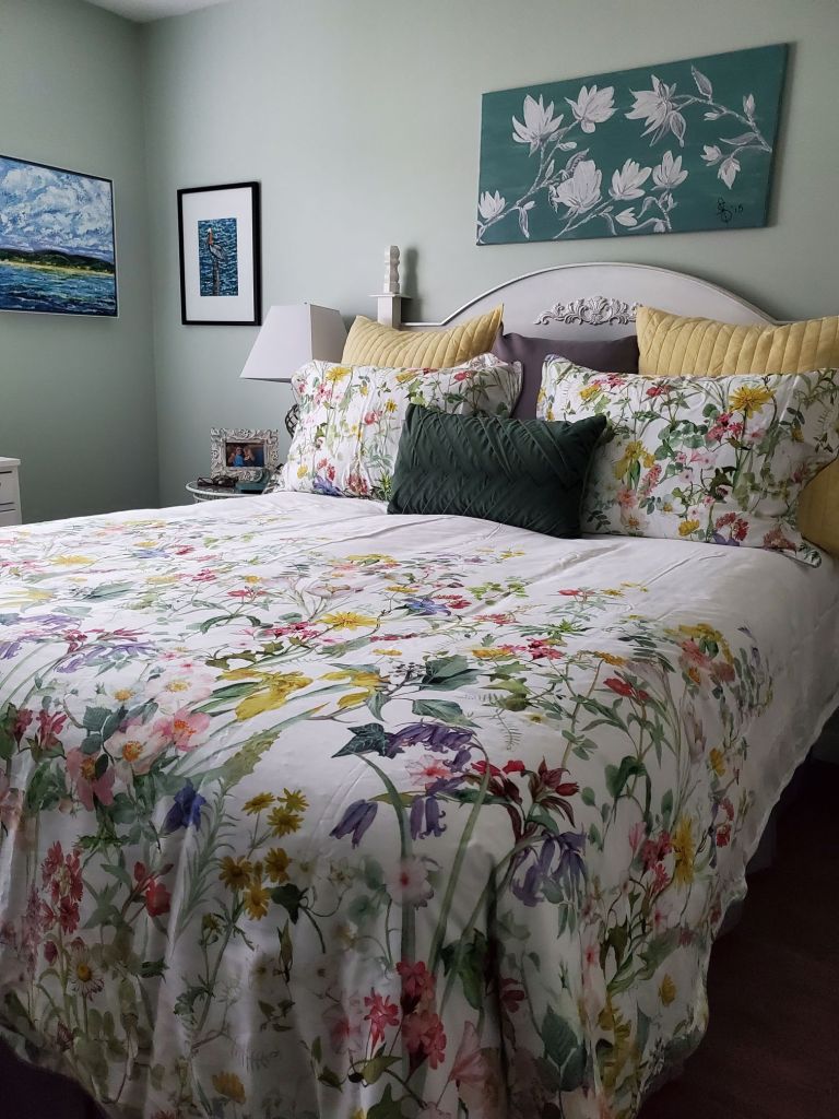 Wahoo!! Can you see me smile? I am very pleased with how “Floral Extravaganza” looks hanging on the wall above the bed. That makes the redecorated bedroom complete.