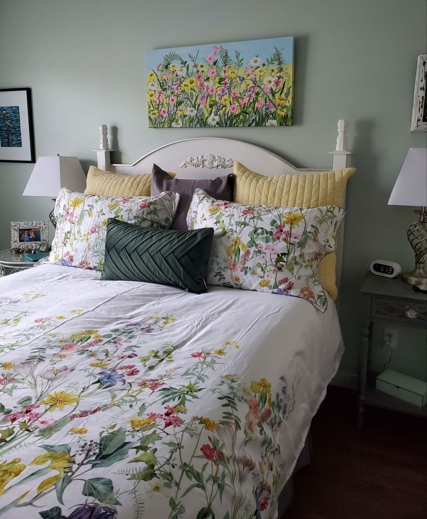 Wahoo!! Can you see me smile? I am very pleased with how “Floral Extravaganza” looks hanging on the wall above the bed. That makes the redecorated bedroom complete.