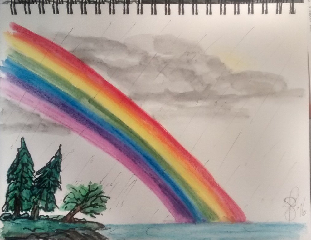 Posted: April 3, 2016 Filed under: #doodlewashaday, Gallery Mongyo Watercolor Crayons, Just for fun, Sketch book, Sketches/Doodles, Susan Feniak art, Uncategorized | Tags: #doodlewashaday, Gallery Mongyo Watercolor Crayons, Just for fun, original art, sketch book, Sketches/Doodles, Susan Feniak art 24 CommentsThanks to some cajoling from Charlie O’Shields over at doodlewash.wordpress.com I am participating in a daily exercise of doing a doodlewash a day for the month of April. I will try and do something everyday but some time restraints could prove difficult. Luckily for me Charlie has set it up as a “play when you can”. Here we are April 3rd and this is my first!! Yup, its play when I can!! Five minutes is all I had but it was nice to find a rainbow in my day.