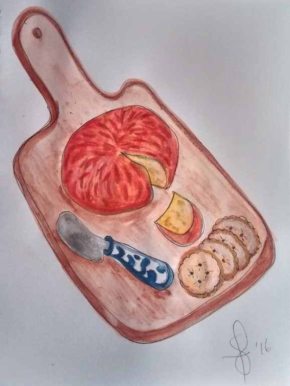 Posted: April 17, 2016 Filed under: #doodlewashaday, Gallery Mongyo Watercolor Crayons, Just for fun, Sketch book, Sketches/Doodles, Susan Feniak Originals, Uncategorized | Tags: #doodlewashaday, Gallery Mongyo Watercolor Crayons, Just for fun, sketch book, Sketches/Doodles, Susan Feniak Original Art 22 CommentsYes April 17th is set aside for Cheeseballs! It was either that or Bat Appreciation Day. Don’t get me wrong I have absolutely nothing against bats. Its also Haiku Poetry Day. I could muster up a Haiku but having time to illustrate it too? So here you have a cheese board, cheese knife, cheeseball and crackers. Snack time!! Enjoy!