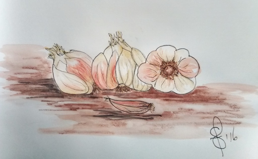 Posted: April 19, 2016 Filed under: #doodlewashaday, Gallery Mongyo Watercolor Crayons, Just for fun, Sketch book, Sketches/Doodles, Susan Feniak Originals, Uncategorized | Tags: #doodlewashaday, Gallery Mongyo Watercolor Crayons, Just for fun, sketch book, Sketches/Doodles, Susan Feniak Original Art 24 CommentsApril 19th Yay! Its National Garlic Day! Yes I am excited because I love to cook and I love garlic. If you were to be invited to our home for supper we would hope you liked garlic too. Because if everyone eats it we can bare the after effects! Our local farmers grow some of the finest flavourful garlic. Anticipation for harvest time mounts!!