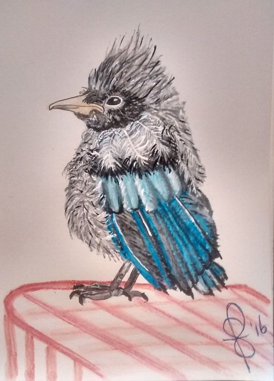 April 8th Today instead of doing a National Day I have drawn a bird for Draw A Bird Day. This youngster is a juvenile Steller’s Jay. I couldn’t resist such a cute fuzzy character. (I plucked the imagine from the internet and have no idea who to give credit to for the photo.) Its been a busy week here at my work desk and easel. Time for a breather. Have yourselves a grand weekend. I am looking forward to seeing all the birdie drawings and posts from my WP friends. Cheers, Susan