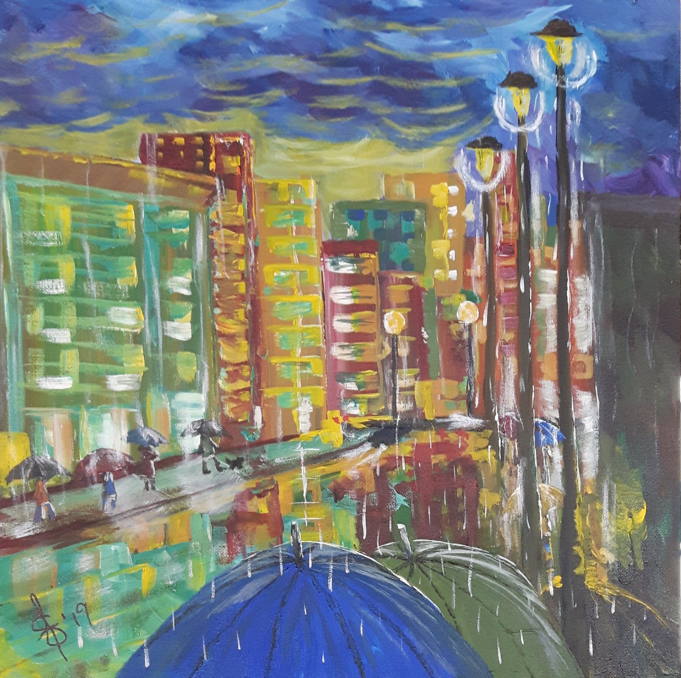 Posted: September 12, 2019 Filed under: Acrylic on Canvas, Acrylic Paintings, Art for Sale, Canadian Artist, Cityscape, Golden Acrylics, Golden Artist Colors, Just for fun, Opus Art Supplies, Original art, Rainy night, Shuswap Artist, Susan Feniak art, Susan Feniak Originals, Susan Feniaks Easel, Umbrellas, Uncategorized | Tags: Acrylic on canvas, Art, Canadian Artist, Cityscape, For the joy of it, Golden Acrylics, Golden Acrylics on Canvas, Golden Artist Colors, Opus Art Supplies, original art, Rainy night, Shuswap Art, Shuswap Artist, Susan Feniak art, Susan Feniak Original Art, Susan Feniak Acrylic, Umbrellas 6 CommentsHurry Home! This one is drying on my easel. I wanted to do something a bit different. It certainly was fun to do. Who knew a rainy city night could be fun? I had the idea rumbling around in my imagination for awhile. Putting it all on canvas was the next trick. Hope you like it. Acrylic on 20″ x 20″ x 1.5″ thick canvas painted on all sides. No frame needed. $250.00