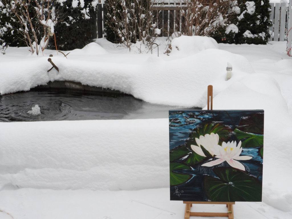 Posted: December 14, 2013 Filed under: Acrylic on Canvas, Gardening/Flowers, Landscapes, Original art | Tags: Acrylic on canvas, Flowers, landscape, Local artist, original art, Paintings from the garden, Paintings of Flowers, Shuswap Art, Susan Feniak Acrylic 4 CommentsUn-finished painting but had to post this anyway. For interest sake. Its hard to believe that my latest painting is based on the water lilies that were in my pond just a short couple of months ago. Just look at the frozen snowy landscape it is now!!