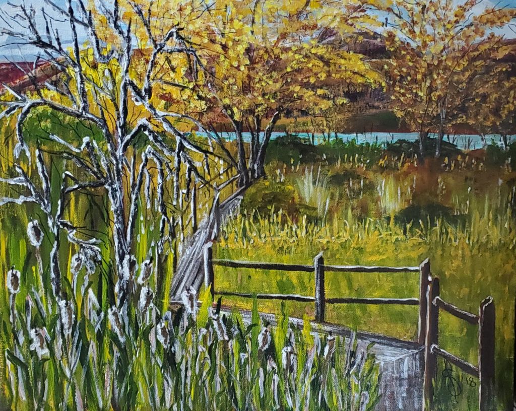 This time I have a revision of a painting that I did back in 2018 to share with you. I was never particularly happy with “Raven Trail Autumn” but at the time I decided to leave it alone. Every time I looked at it I wanted to do something to it but was never sure what. The boardwalk bothered me and the lake in the distance did too. So this week I finally put Raven Trail Autumn back on my easel and had a go at changing it. Hopefully for the better. As you can see I posted the 2018 version on top and the 2024 revision bellow it.