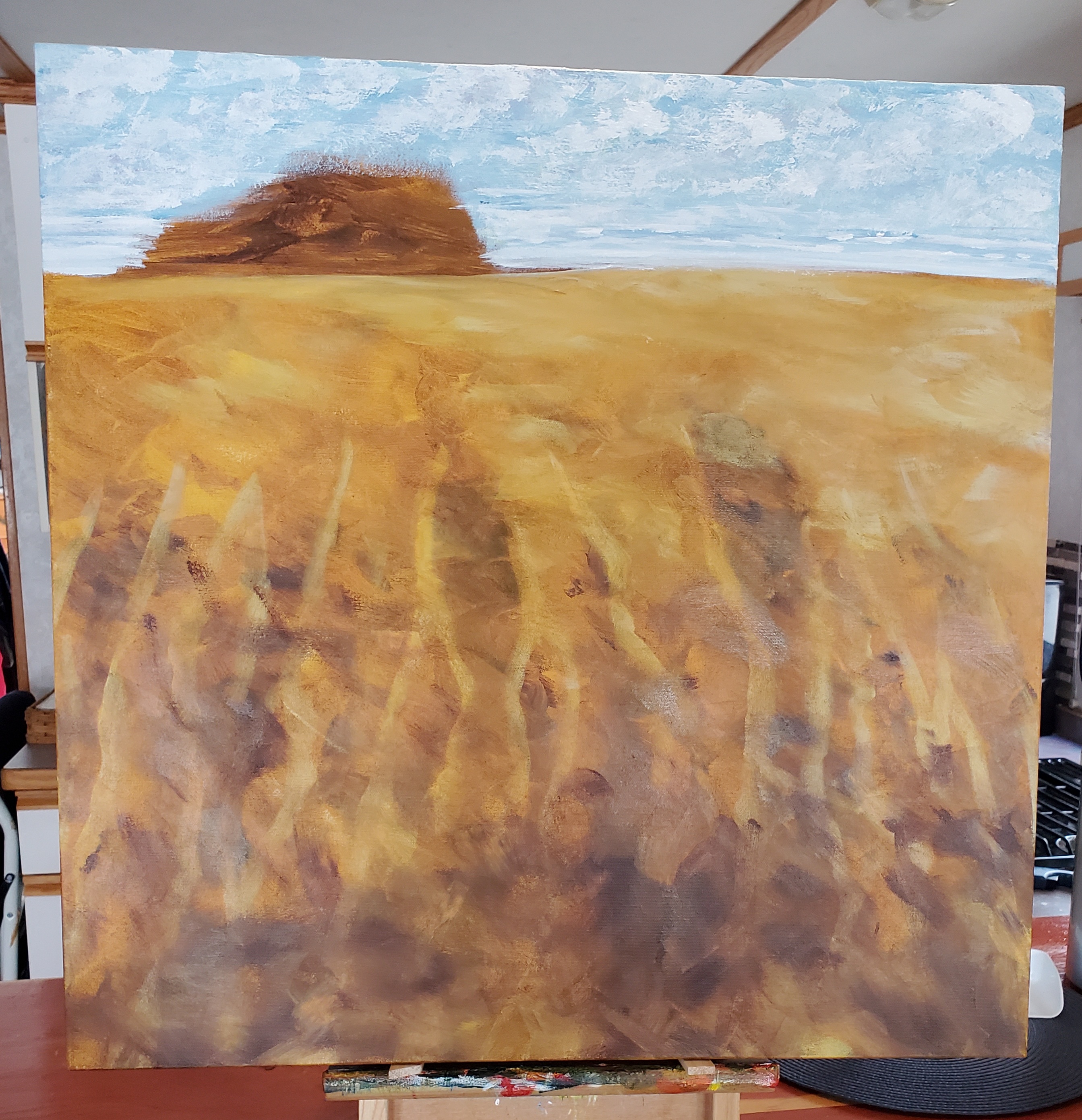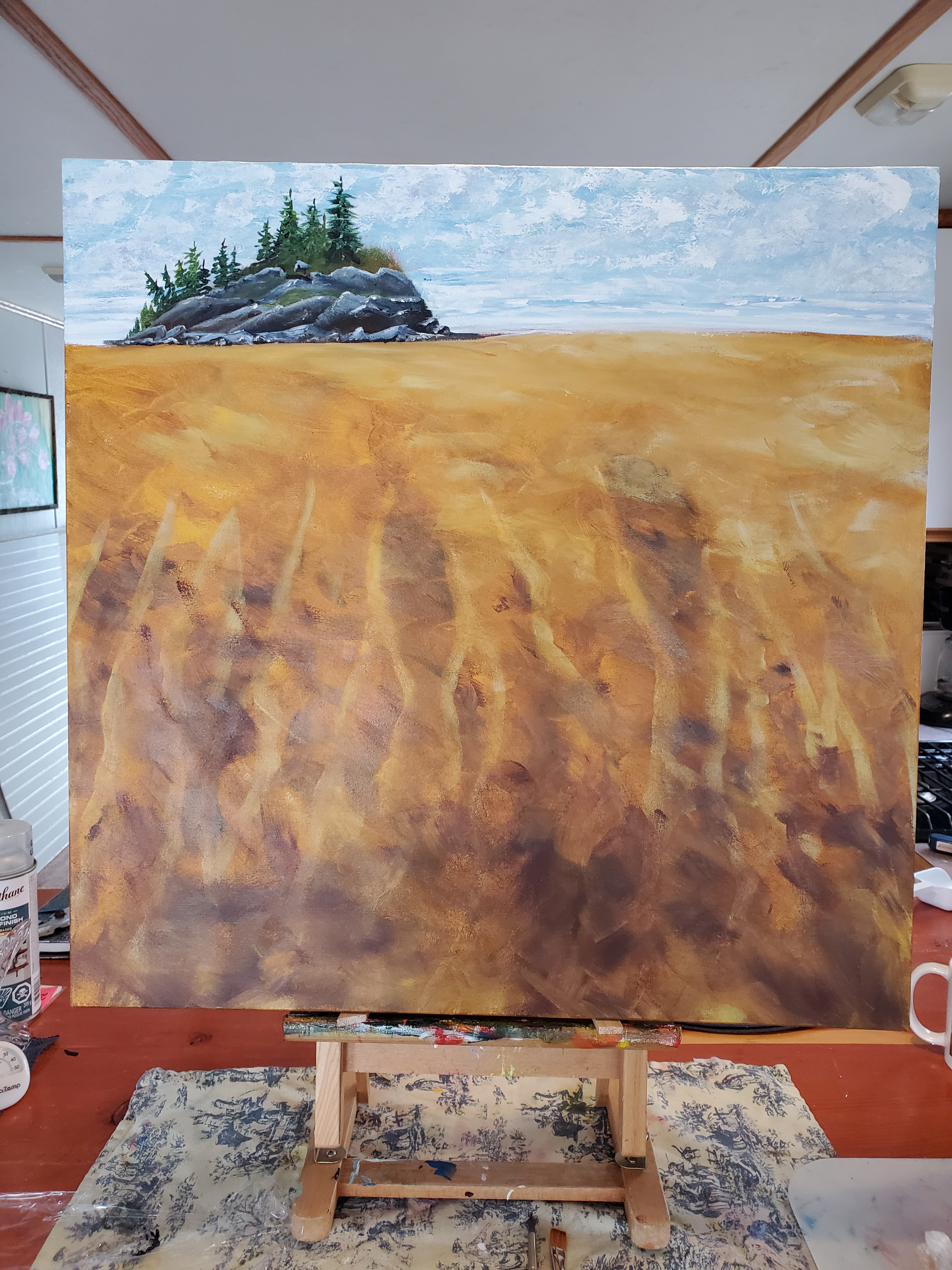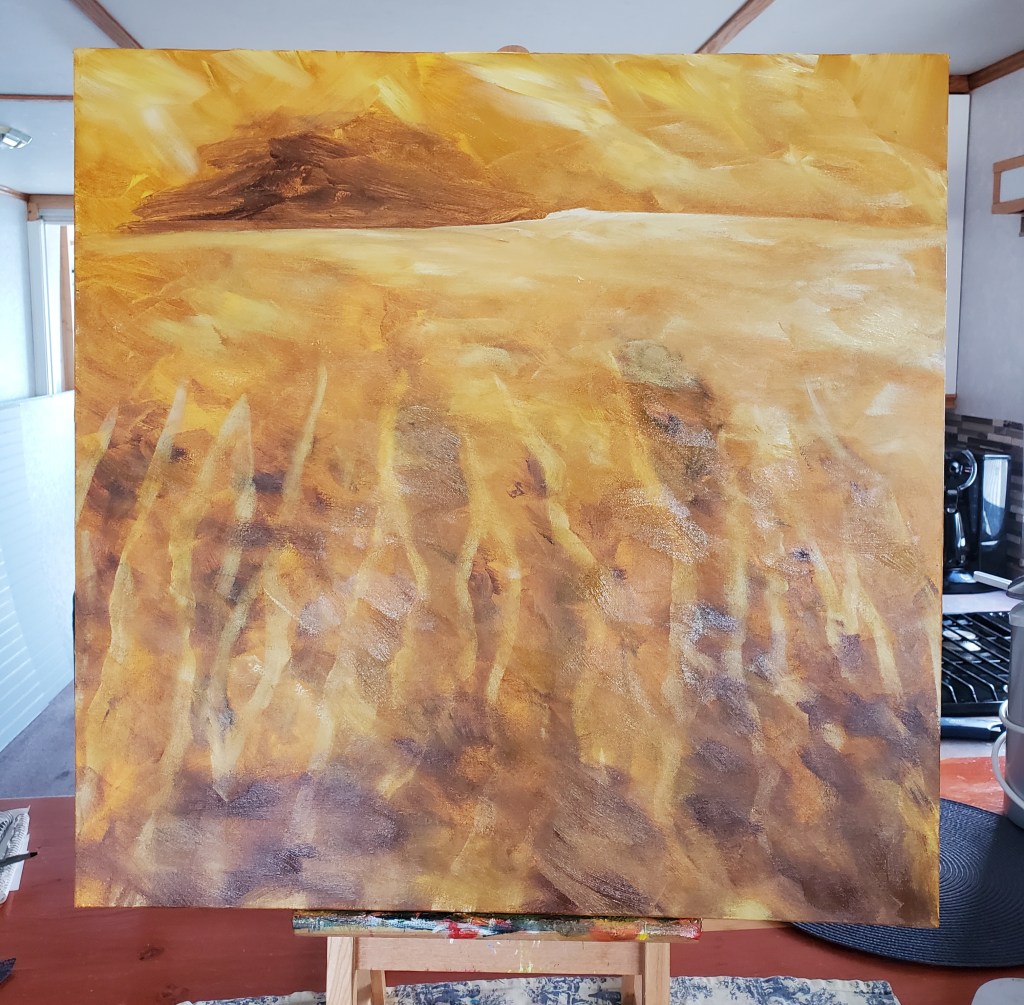 I have another painting started on my easel. Barely started. But here are a few progress photos. I have been doing so many floral creations lately that I decided it was time for a change. Cheers Susan Feniak. Acrylic on a 24″ x 24″ gallery canvas.