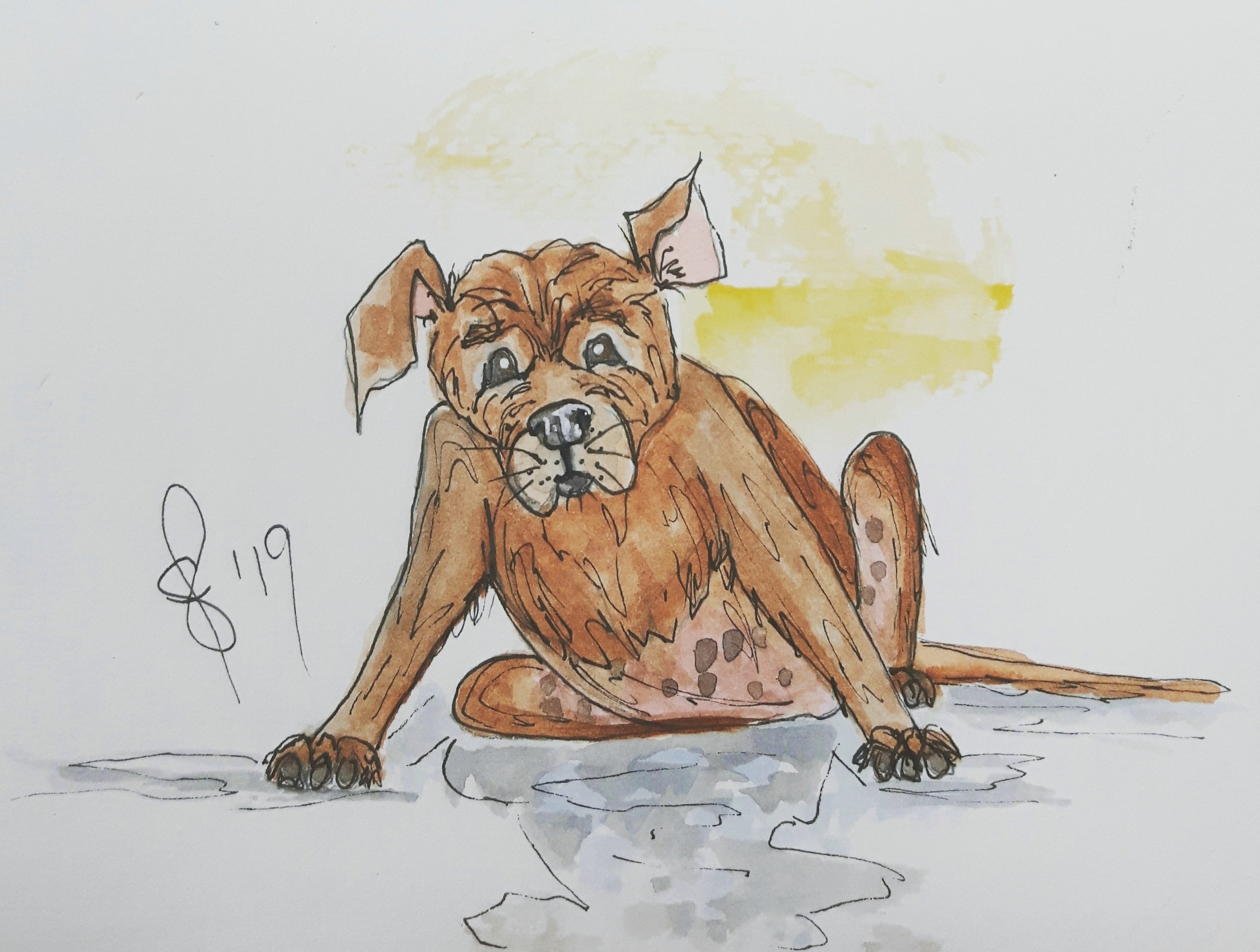 Posted: July 9, 2019 Filed under: #WorldWatercolorGroup, #Worldwatercolormonth, Just for fun, Paintings of Dogs, QoR watercolor, Sketch book, Susan Feniak art, Susan Feniak Originals, Susan Feniak water color and ink, water color and ink, Whimsy | Tags: #WorldWatercolorGroup, #Worldwatercolormonth, #worldwatercolormonth2019, Cute, Fabriano papers, Paintings of Dogs, Paintings of puppies, QoR watercolor, Sketches and Doodles, Susan Feniak Original Art, Susan Feniak water colours, Susan Feniak watercolor and ink, Whimsy 4 CommentsDay 9 World Watercolor Month and the prompt is Shadow Play. Tilda the pup looks a tad bewildered by her shadow. No doubt she will soon be pouncing on it and chasing it about. I am waiting to watch Tilda play with her shadow. Maybe her tail will be next?