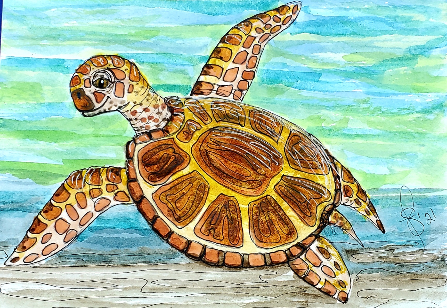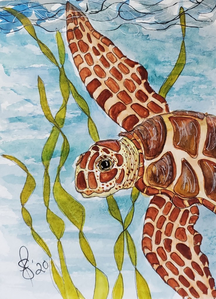 World Watercolor Month Day 22 prompt “Valuable”. You can’t put a value on life. I consider life valuable. My mind wandered to our oceans and our endangered species there. Those species are important to our survival. We have to start caring for them. Taking care of each other during these difficult times is a step in the right direction. Value life. To learn more about World Watercolor Month please visit worldwatercolormonth.com While there check out the shop. All proceeds benefit The Dreaming Zebra Foundation. Thank you. My Tortuga is QoR watercolors and ink on Strathmore card stock.