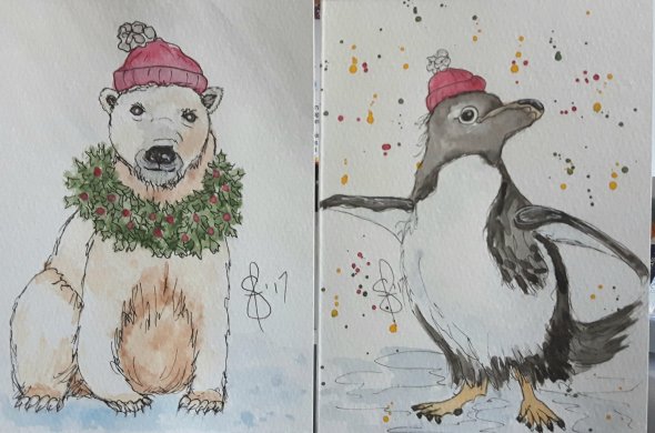 Posted: November 6, 2017 Filed under: #WorldWatercolorGroup, christmas greetings, Holbein Artists' Water Color, Paintings of animals, QOR water color, Strathmore Paper, Susan Feniak art, Susan Feniak Originals, Uncategorized | Tags: #paintingsofanimals, #WorldWatercolorGroup, Christmas, christmas greetings, Cute, Holbein Watercolors, Just for fun, Paintings of animals, QOR water color, Strathmore Watercolor Paper, Susan Feniak Original Art 15 CommentsTwo more of my cards. Can’t believe how much fun I am having creating these. Artist Susan Feniak. Water colour on Strathmore card stock.